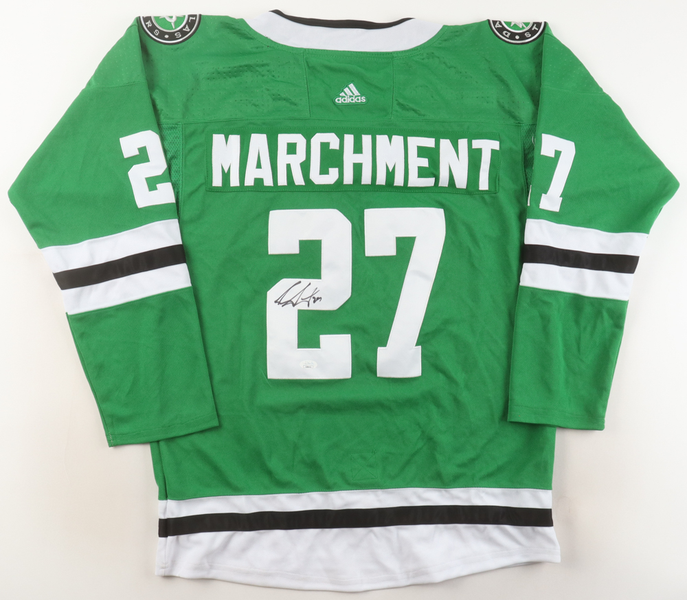 Adidas jersey with everything sewn on, size 54. Hand-signed by Mason Marchment.