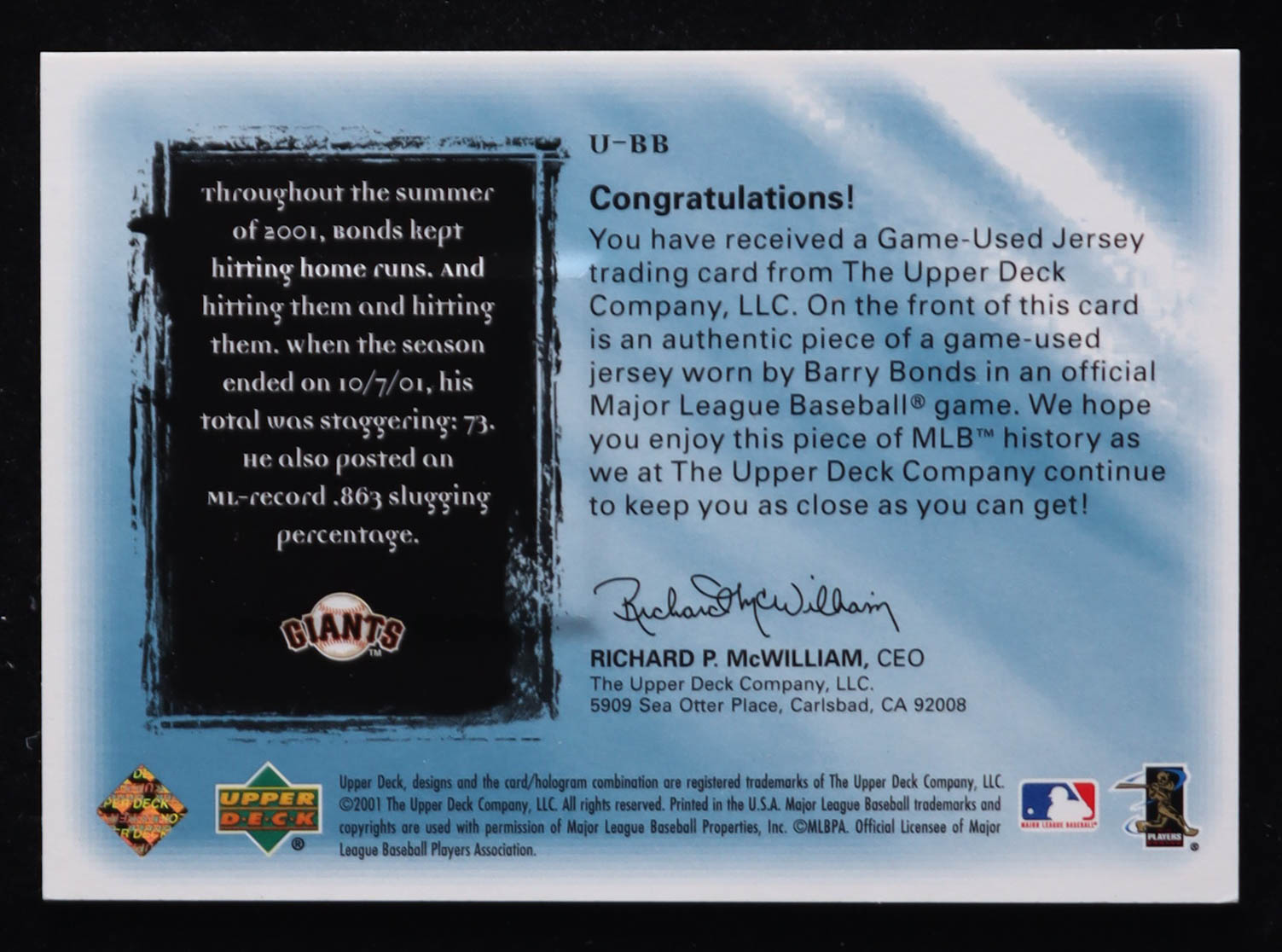 Barry Bonds 2001 Ultimate Collection Game Jersey #UBB #122/150