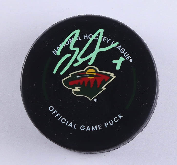 Minnesota Wild Logo Hockey Puck. Hand-signed by Brock Faber.