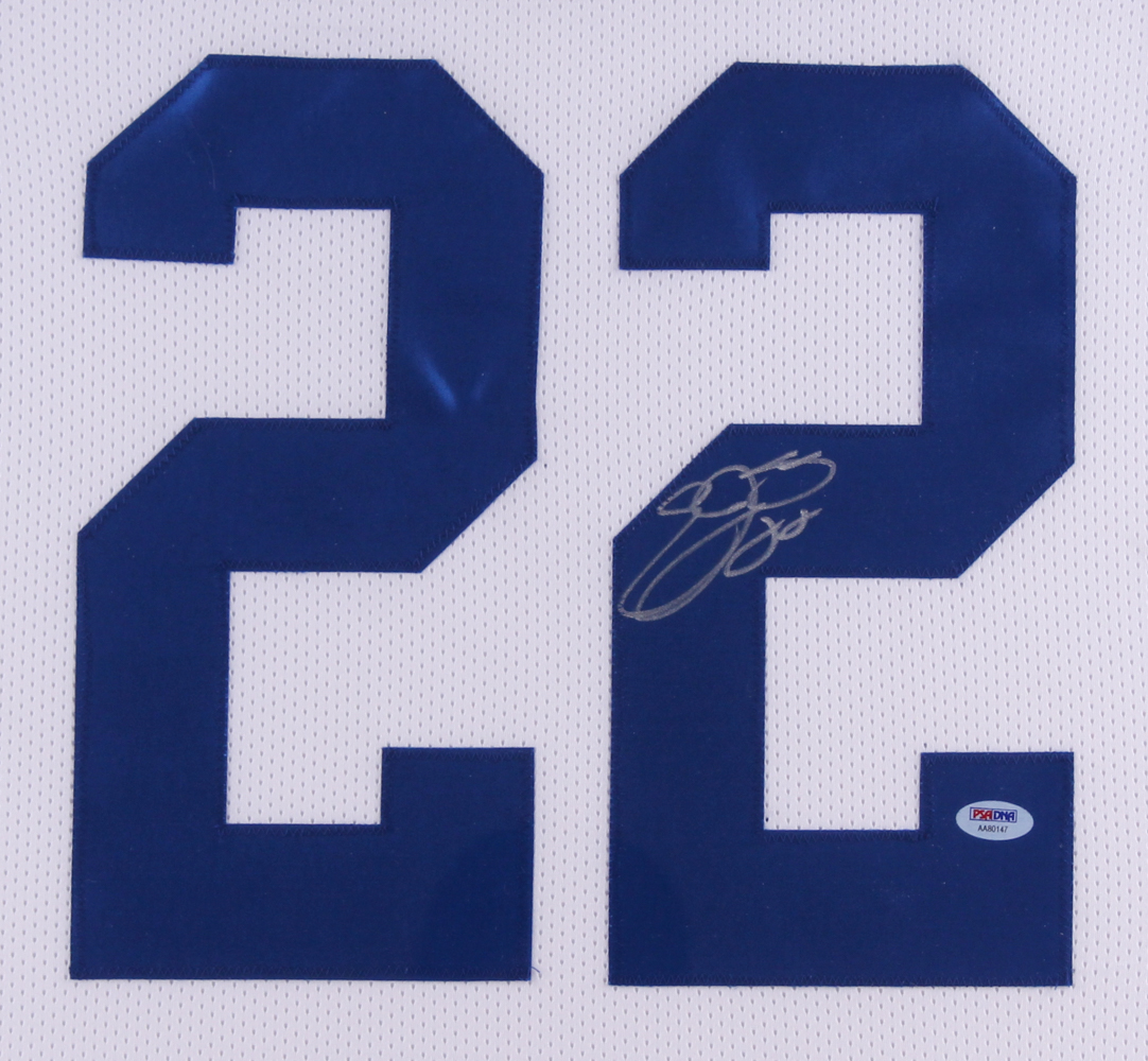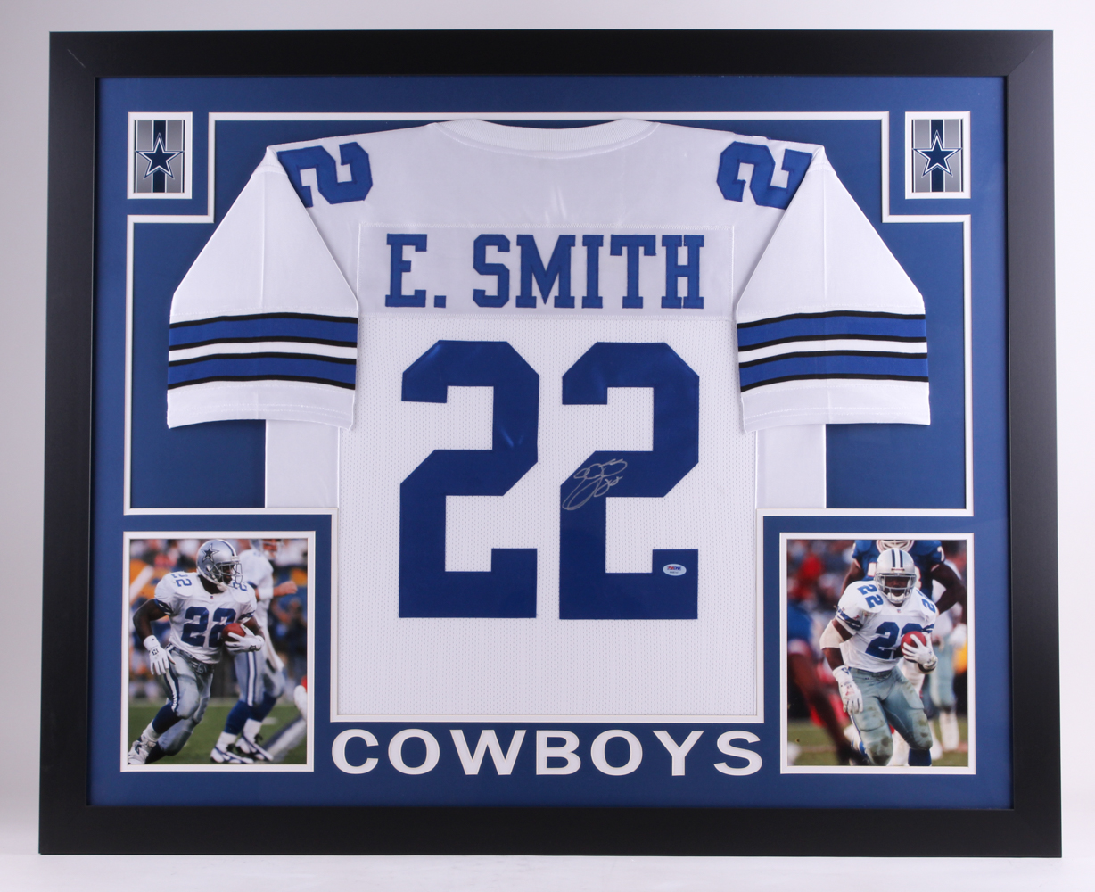 Custom frame measures approximately 35" x 43" in size and features a jersey which has been hand-signed by Emmitt Smith (HOF).