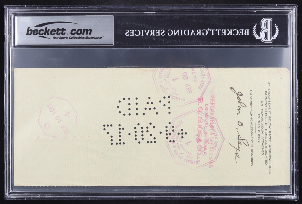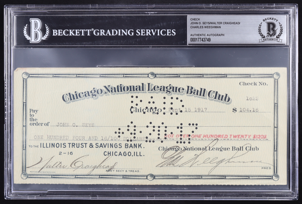 This original Chicago Cubs check is dated September 15, 1917 and was written to John O. Seys. The check is hand-signed by Walter Craighead (D. 1920) & Charles Weeghman (D. 1938). The check is also signed on the back by John O. Seys (D. 1938).