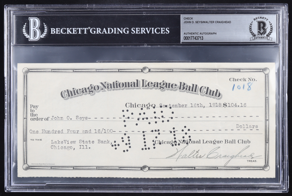 Chicago Cubs Original Check from 1918 Signed by Walter Craighead & John O. Seys (Beckett Encapsulated)