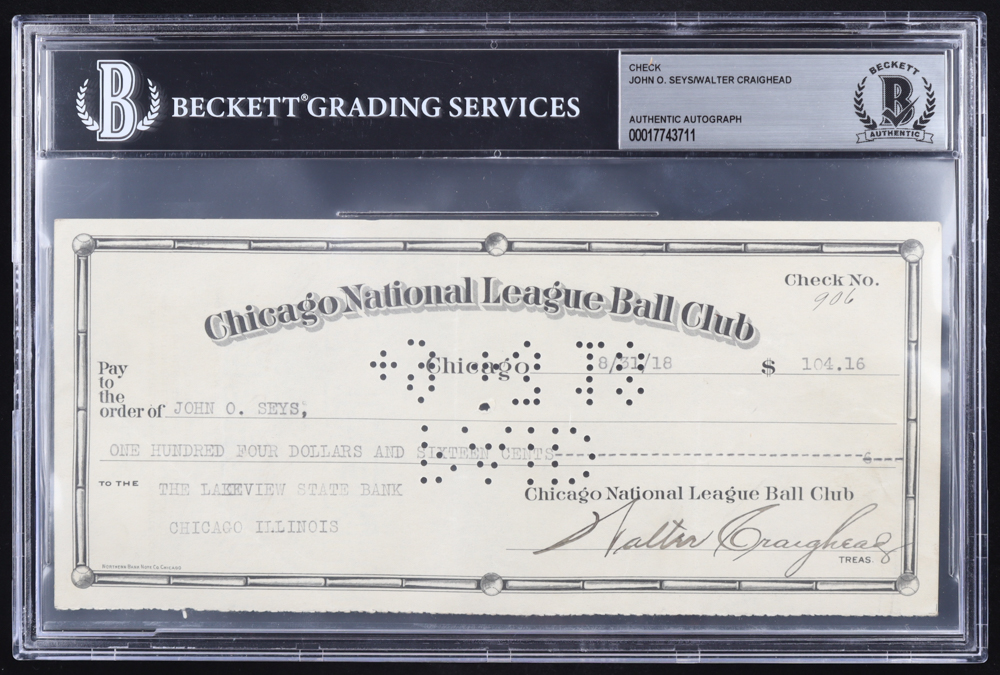 This original Chicago Cubs check is dated August 31, 1918 and was written to John O. Seys. The check is hand-signed by Walter Craighead (D. 1920). The check is also signed on the back by John O. Seys (D. 1938).