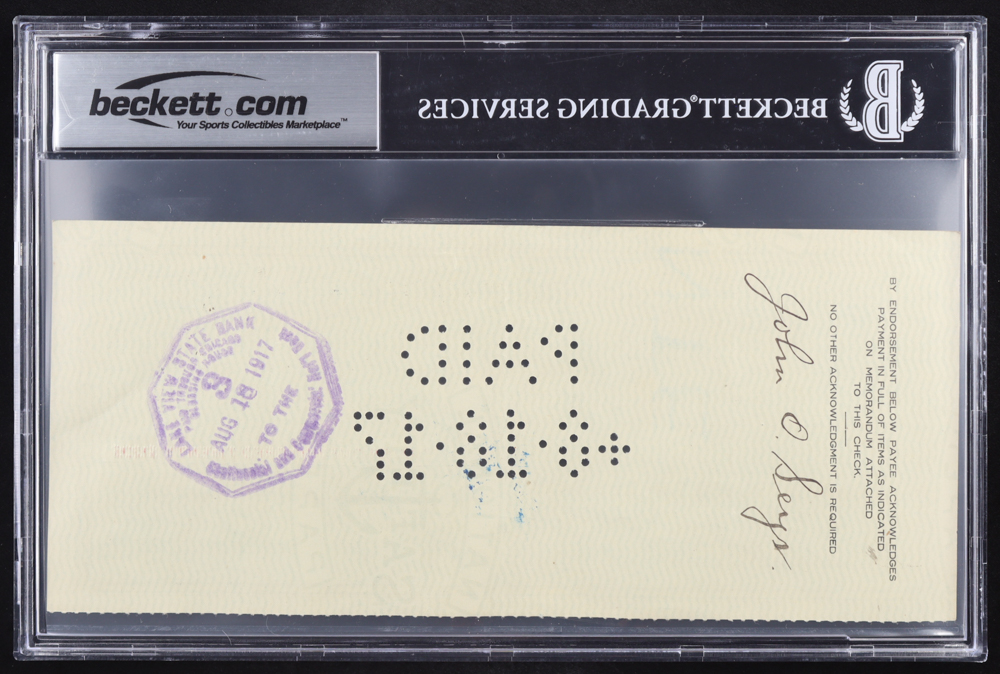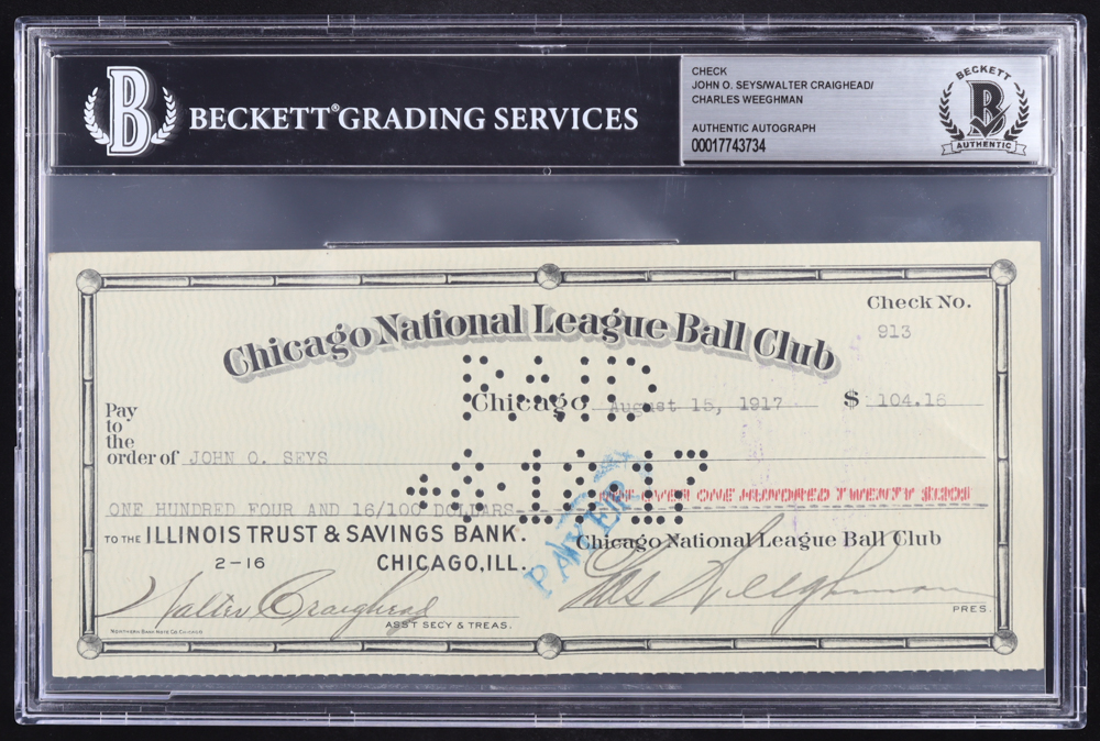 This original Chicago Cubs check is dated August 15, 1917 and was written to John O. Seys. The check is hand-signed by Walter Craighead (D. 1920) & Charles Weeghman (D. 1938). The check is also signed on the back by John O. Seys (D. 1938).