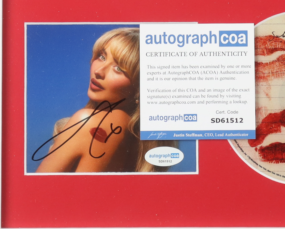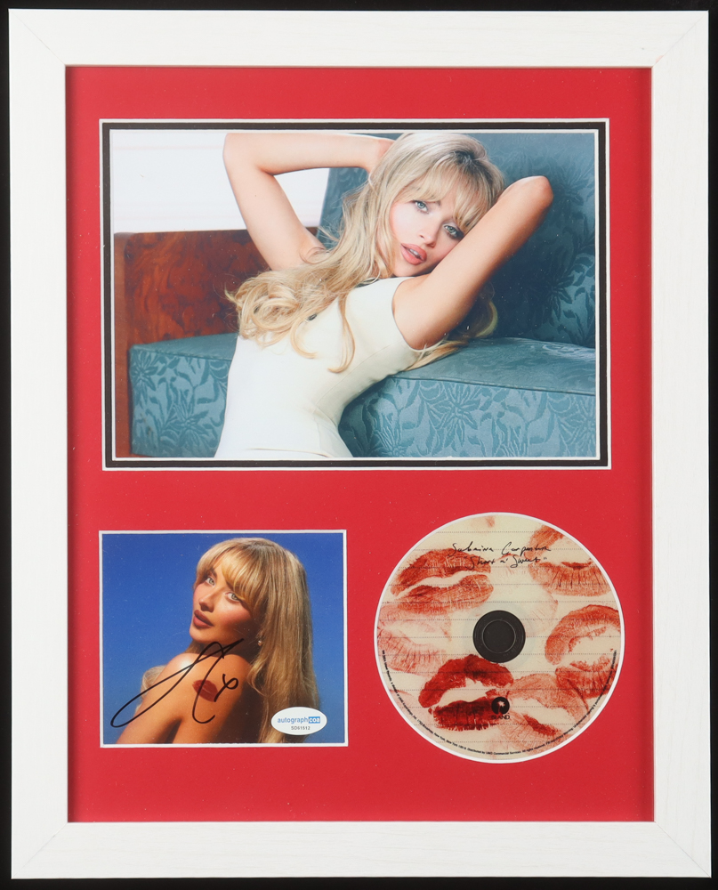 Custom frame measures approximately 12.5" x 15.5" in size. Features a "Short n'Sweet" CD album insert that has been hand-signed by Sabrina Carpenter. The CD disc is included as shown.