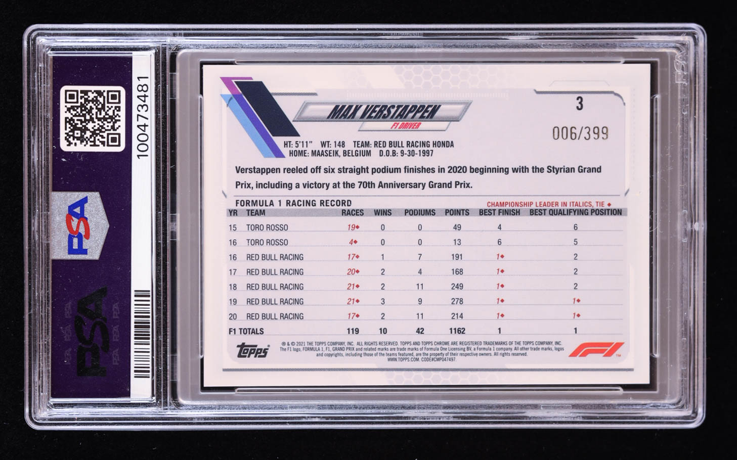 Max Verstappen 2021 Topps Chrome Formula 1 Purple Refractors #3 #006/399 (PSA 10)