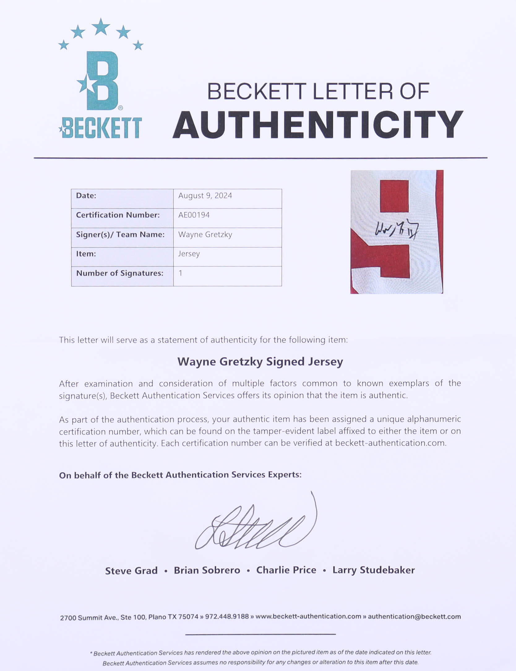 Custom jersey with everything sewn, size L. Jersey has been hand-signed by hockey icon, Wayne Gretzky (HOF).