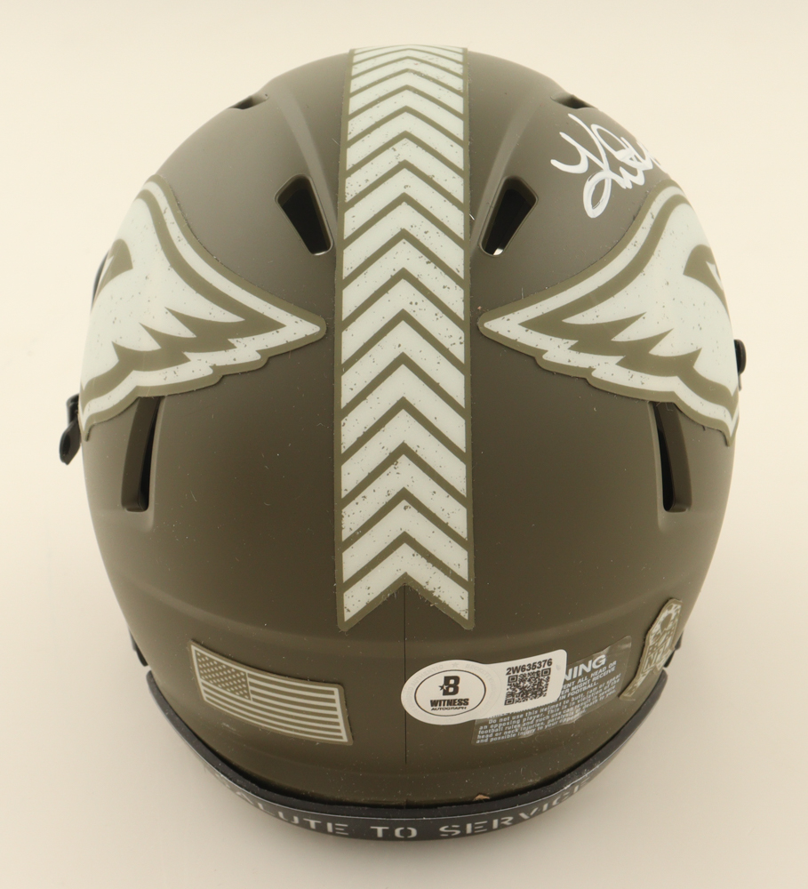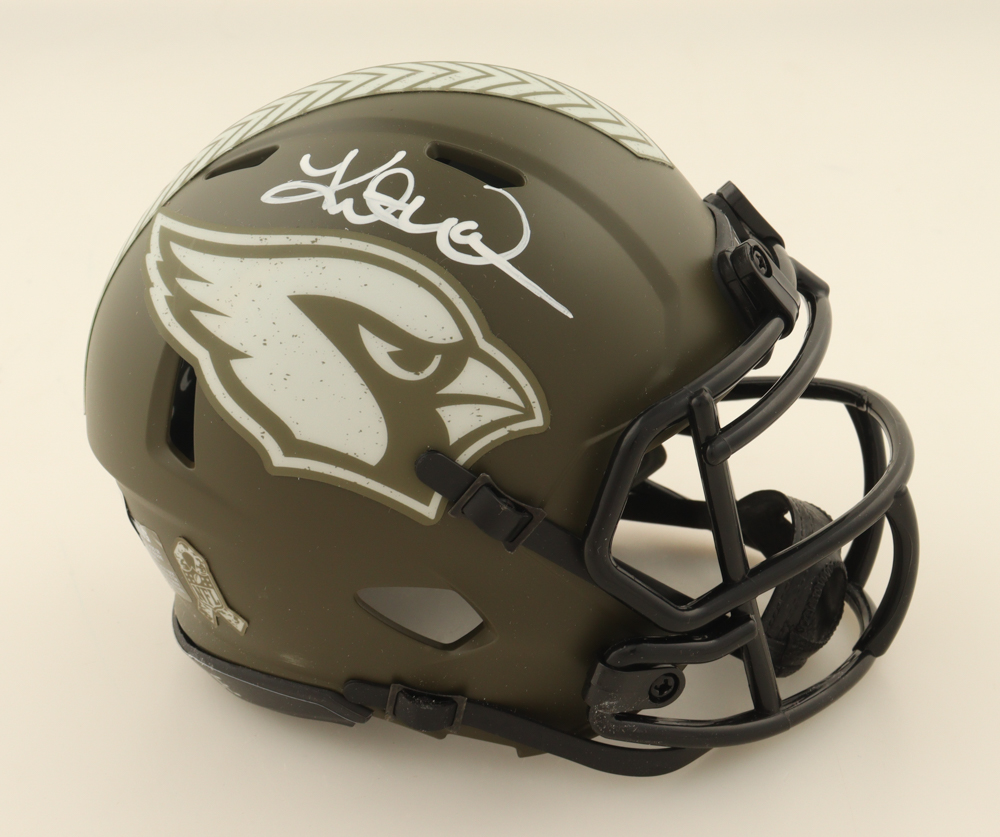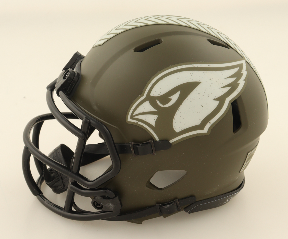 Riddell Arizona Cardinals salute to service alternate speed mini helmet has been hand-signed by Kurt Warner (HOF).