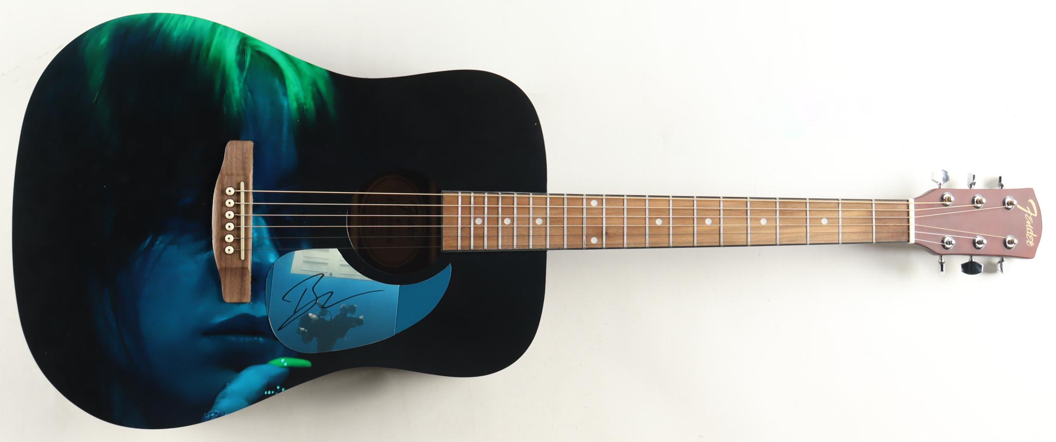 Fender Acoustic guitar measures approximately 38" in length and has been hand-signed on a cut that has been repurposed as the pick-guard by Billie Eilish.