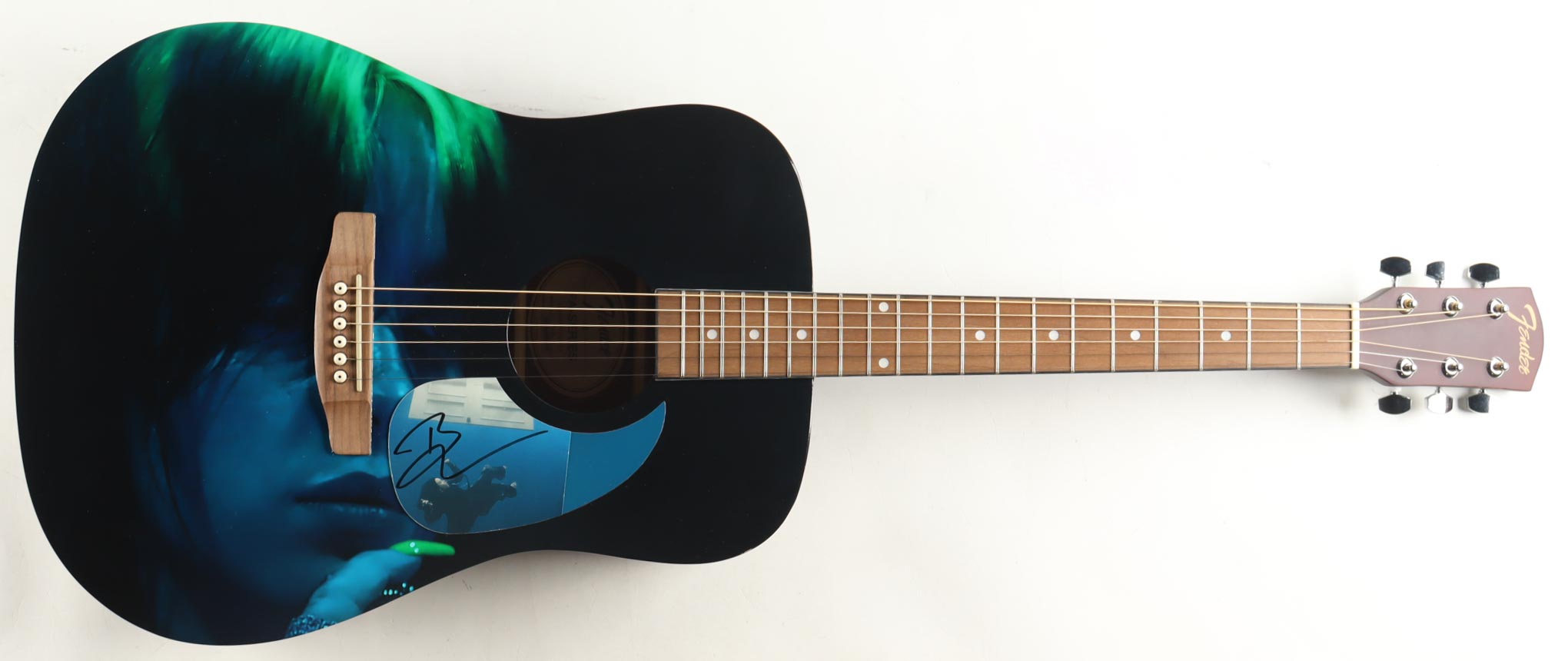 Fender Acoustic guitar measures approximately 38" in length and has been hand-signed on a cut that has been repurposed as the pick-guard by Billie Eilish.
