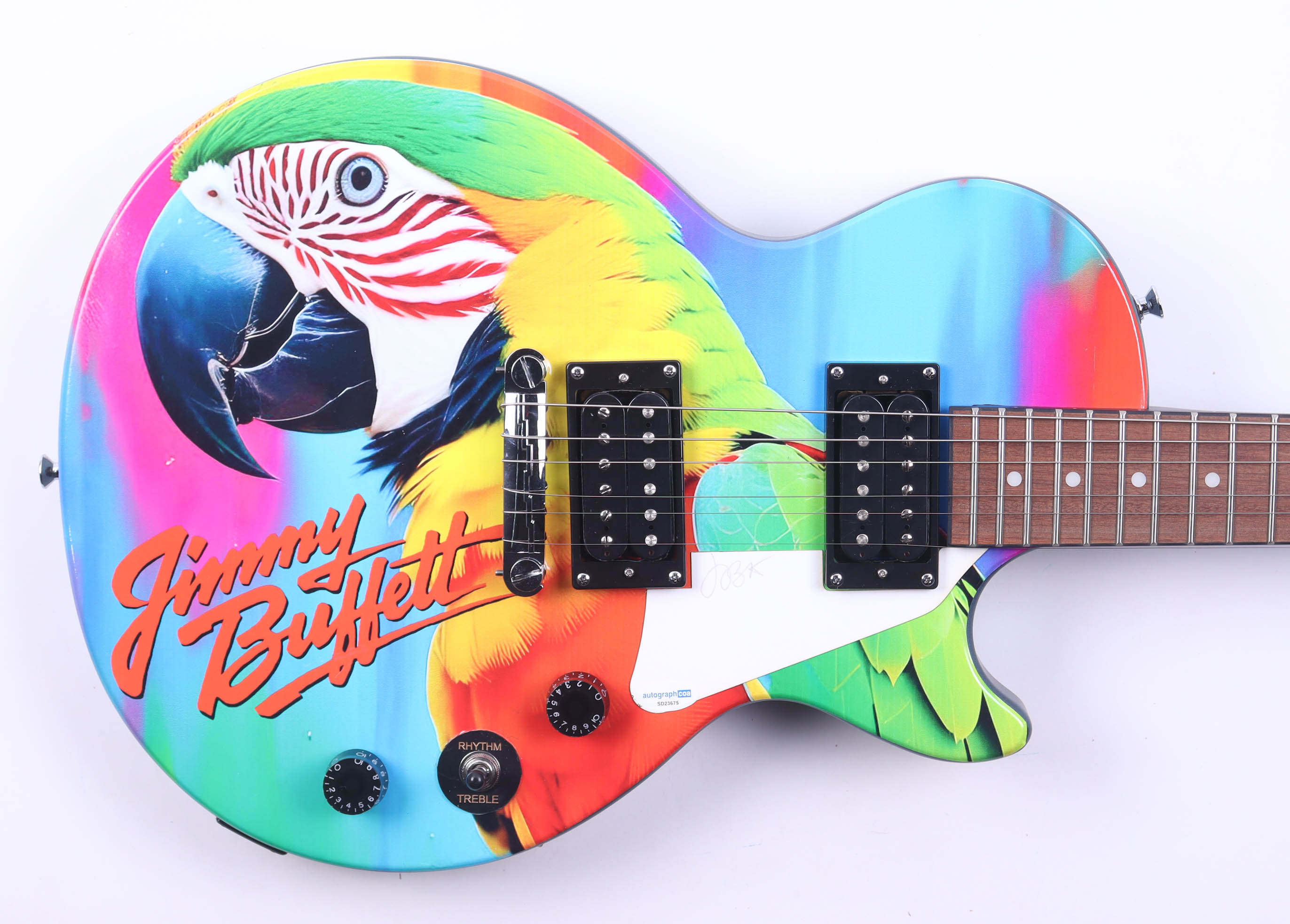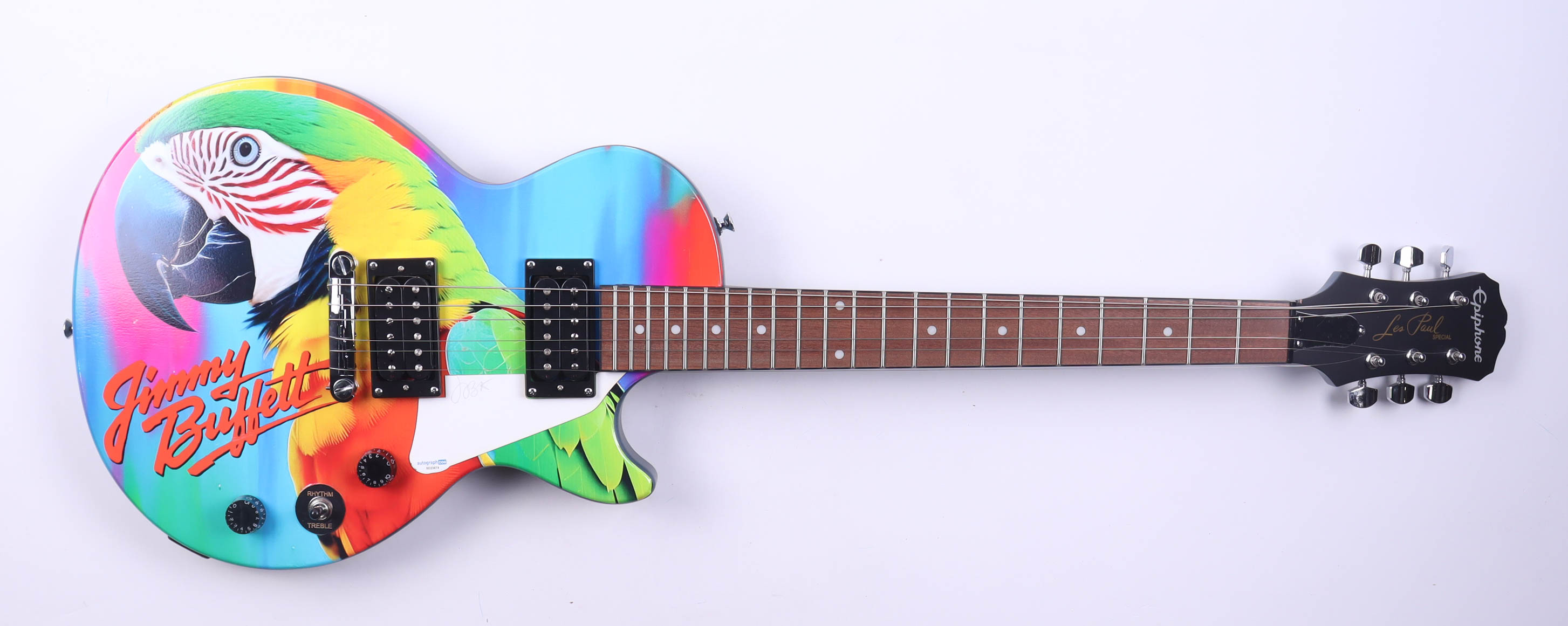 Epiphone Les Paul Special Full-size 39" authentic electric guitar hand-signed on a cut that has been make-shifted into the pickguard of the guitar by music legend, Jimmy Buffett! Please note the signature is fading.