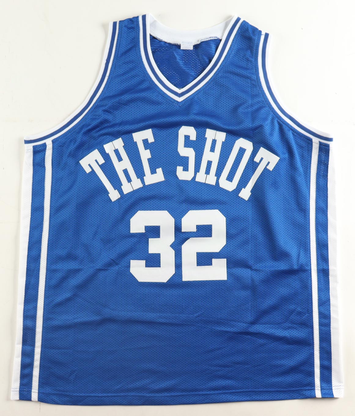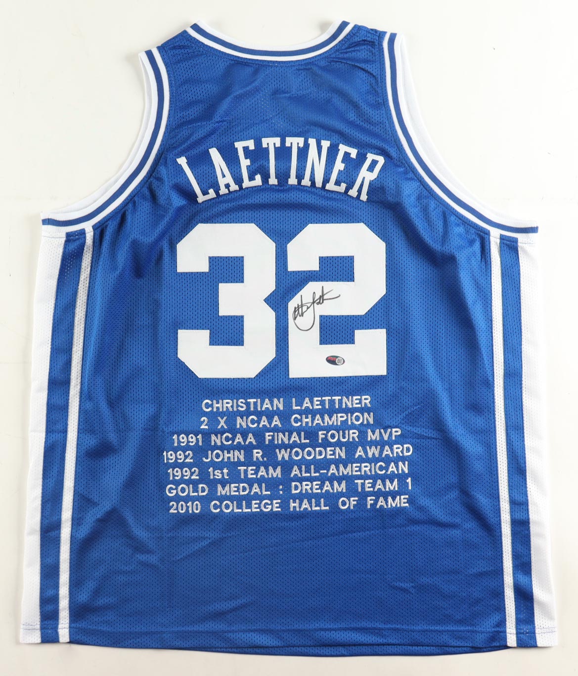 Custom jersey with everything sewn on, size XL. Hand-signed by Christian Laettner. Laettner's career highlights have been custom stitched onto the back of the jersey below the reverse numbers.