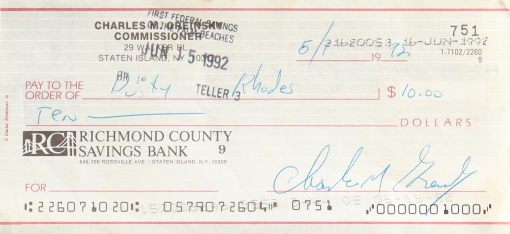 Personal Check dated May 1st, 1992 has been hand-signed by Dusty Rhodes (D. 2009, New York/San Francisco Giants).