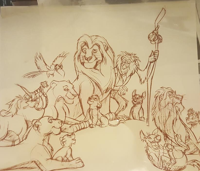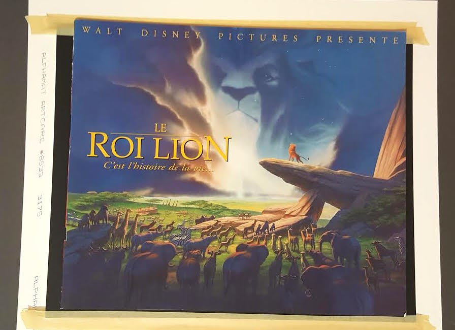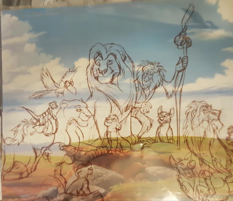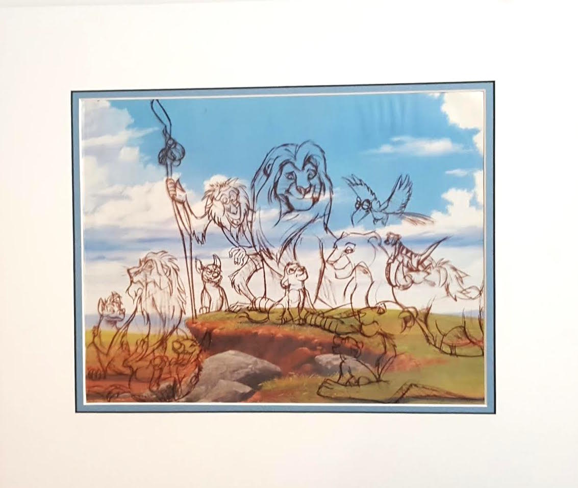 Custom matted serigraph cel measures 16" x 19" in size and is of the original Lion King drawing included in the 1994 Official Premier French Program. It is overlaid on the original scene with a reproduction background.
