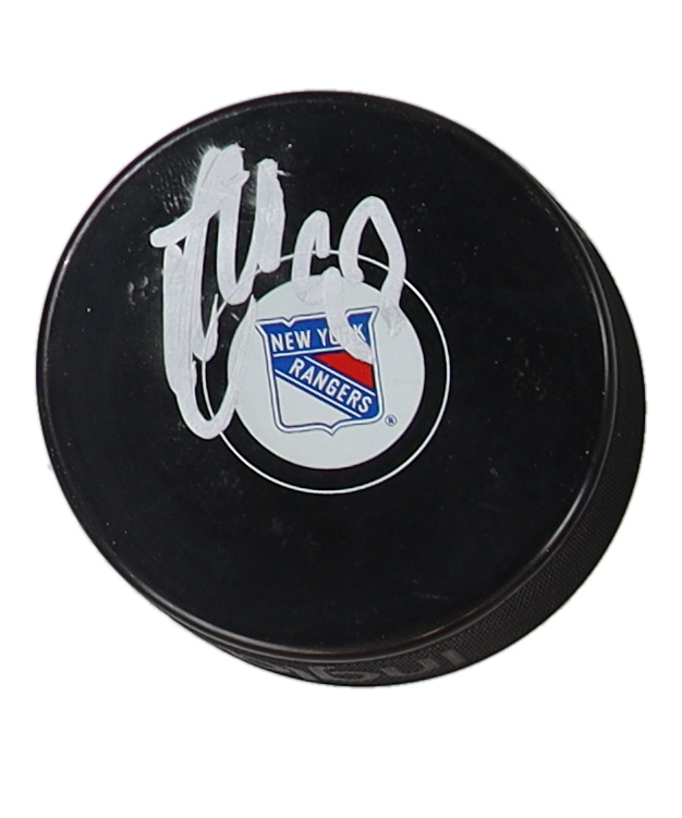 New York Rangers Logo Hockey Puck. Hand-signed by Mika Zibanejad.