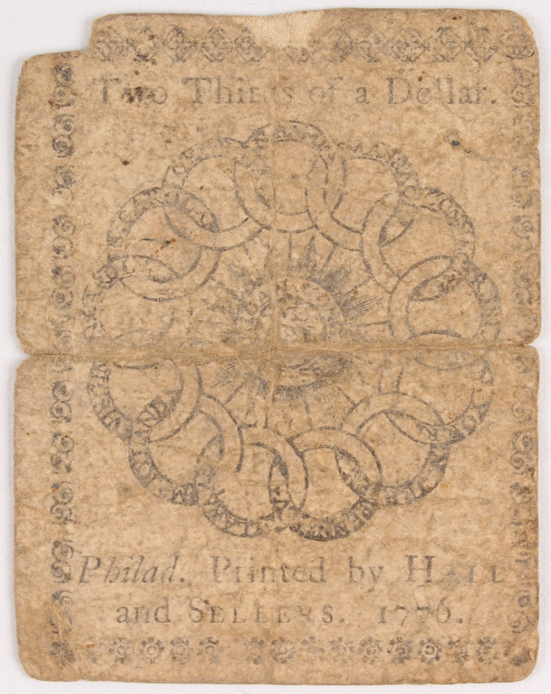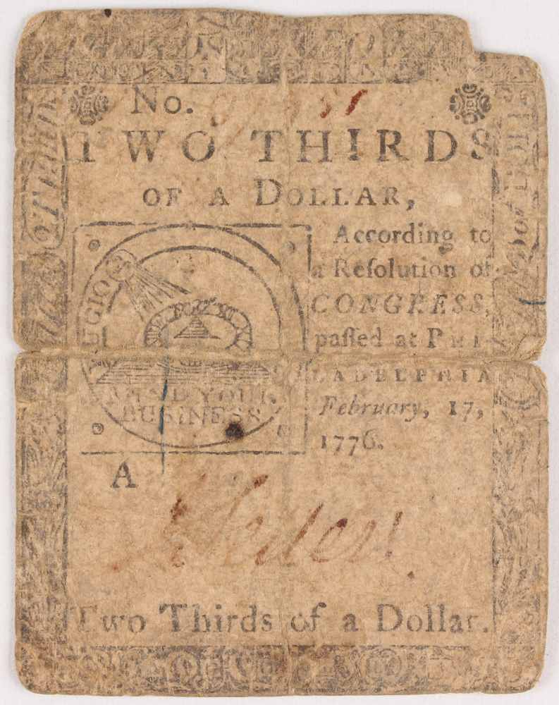 1776 $2/3 Two-Thirds of a Dollar Continental Currency Note. Issued in Philadelphia on February 17th, 1776 by the Continental Congress. Printed by Hall and Sellers. Signed by Nathan Sellers.