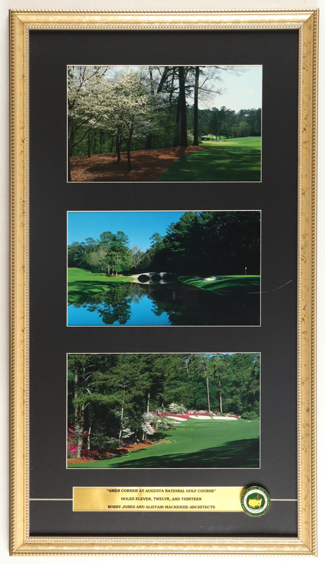 Custom frame measures approximately 17" x 30" in size and features (3) unsigned course photos as well as a pin flag yardage badgel. Please note, the display is unsigned.