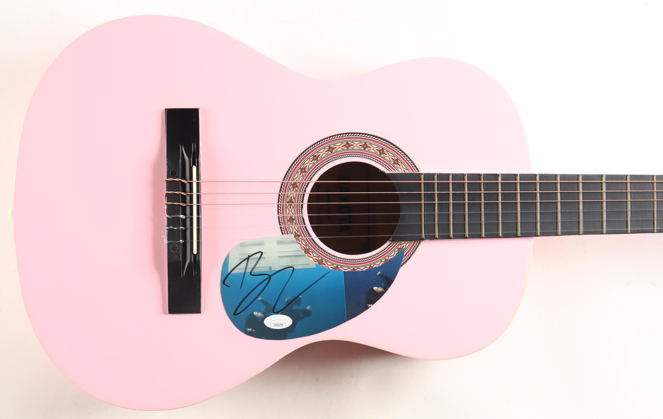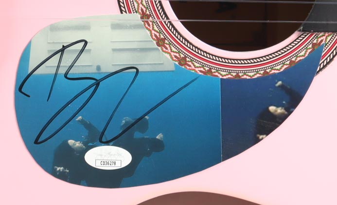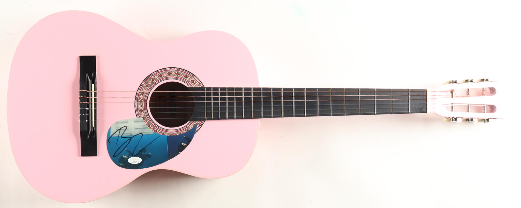 Acoustic guitar measures approximately 38" in length and has been hand-signed on a cut that has been repurposed as the pick-guard by Billie Eilish.