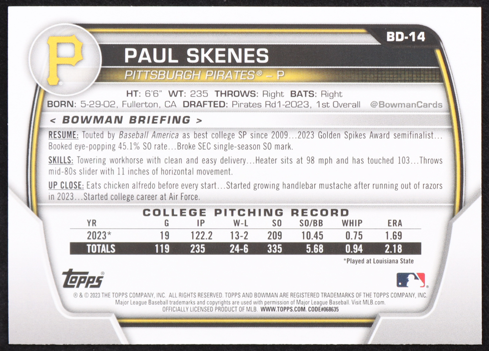 Paul Skenes 2023 Bowman Draft #BD14 RC