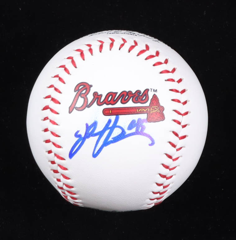 Rawlings Official Major League Atlanta Braves Logo Baseball. Hand-signed by John Rocker (Atlanta Braves). Please note, the signature has been smudged and there are stains throughout the baseball.