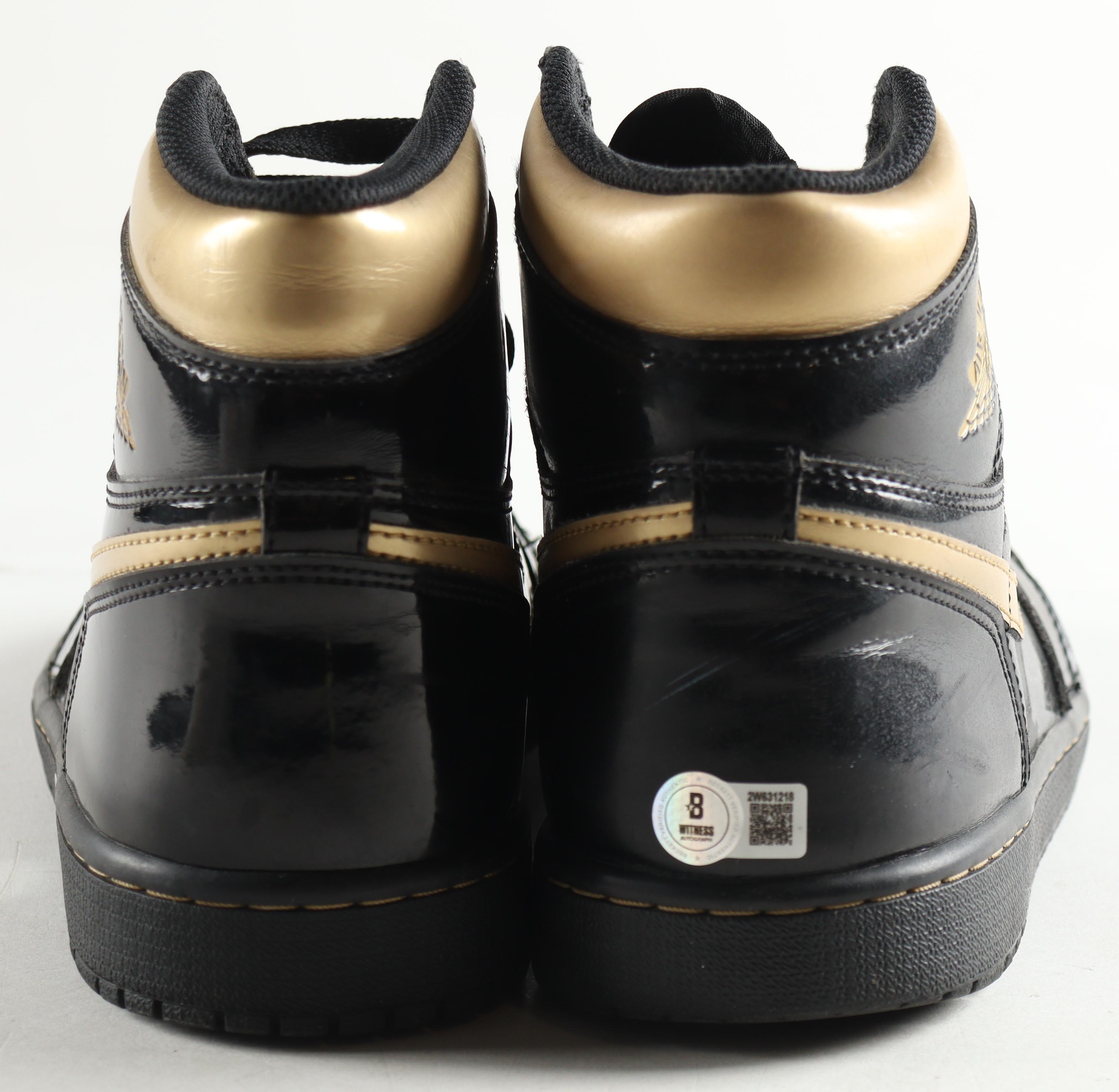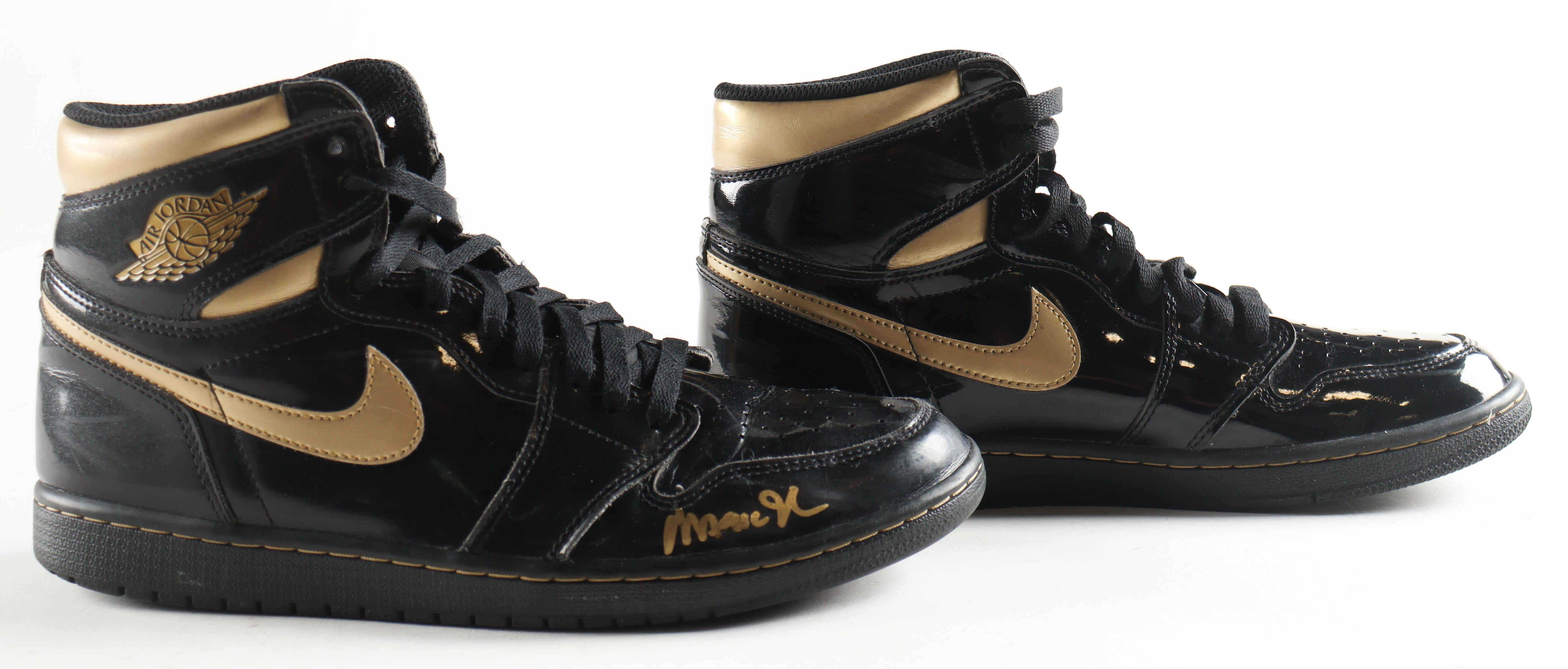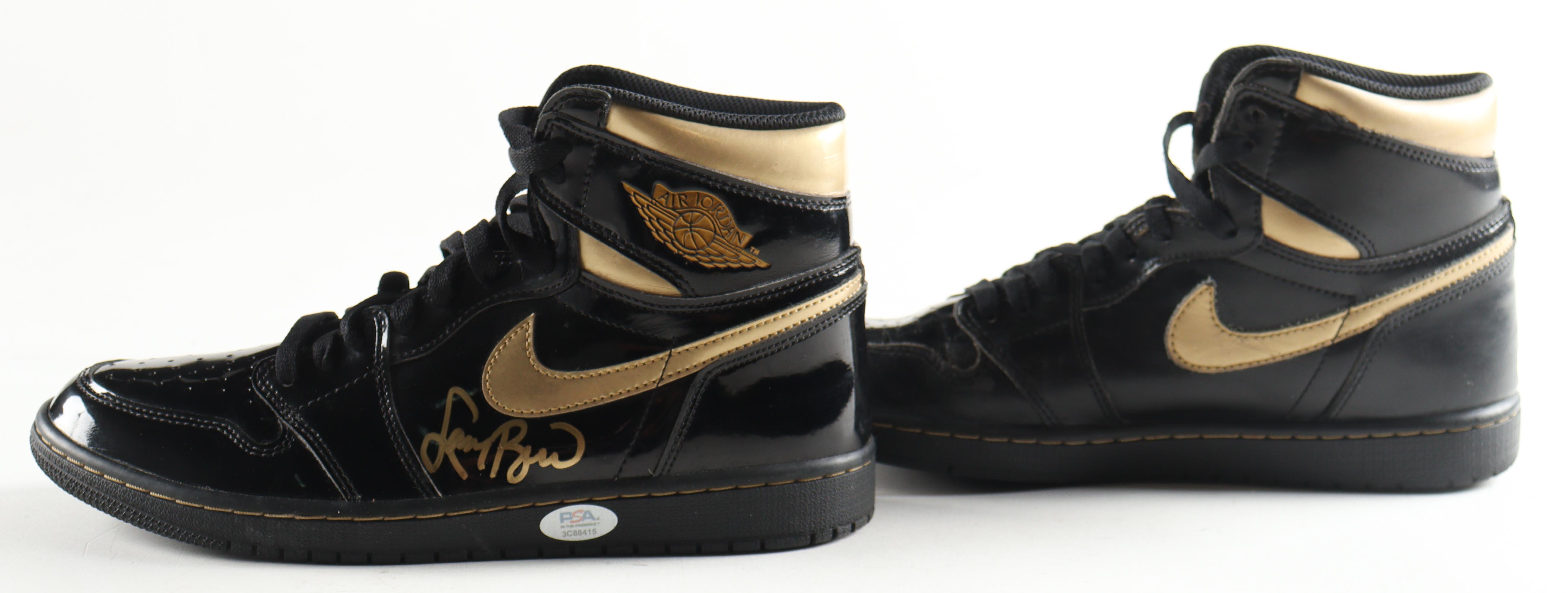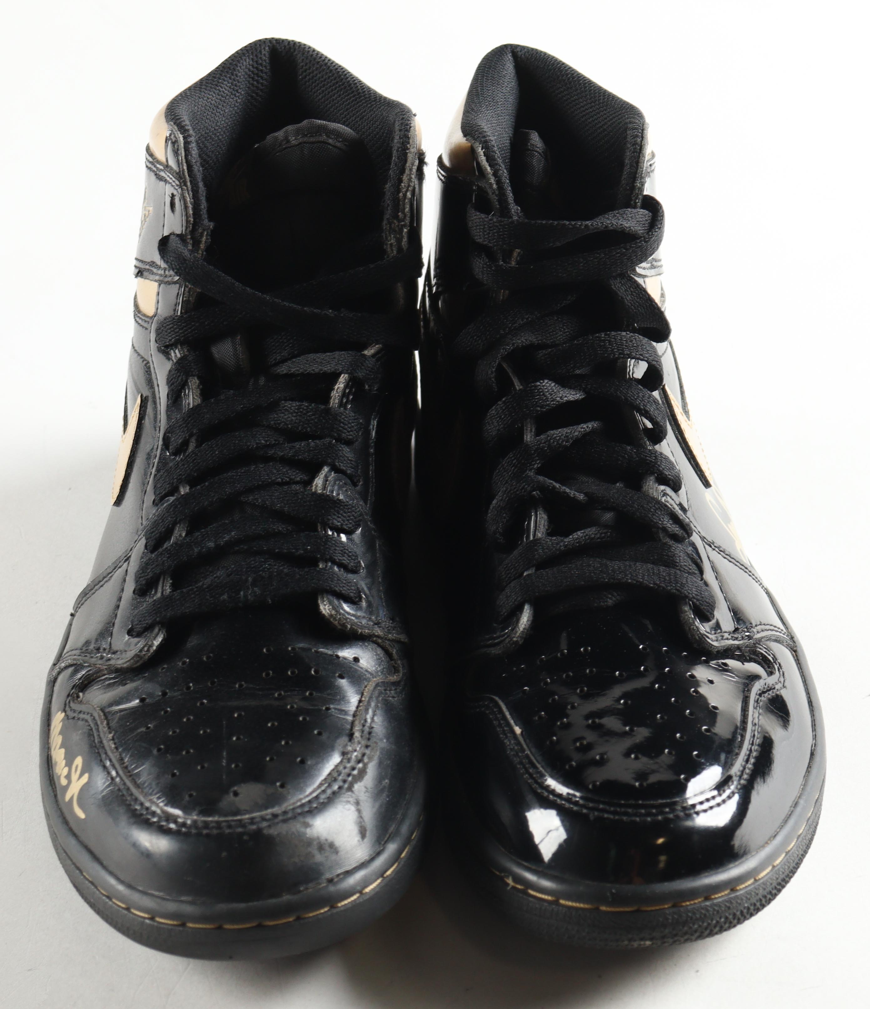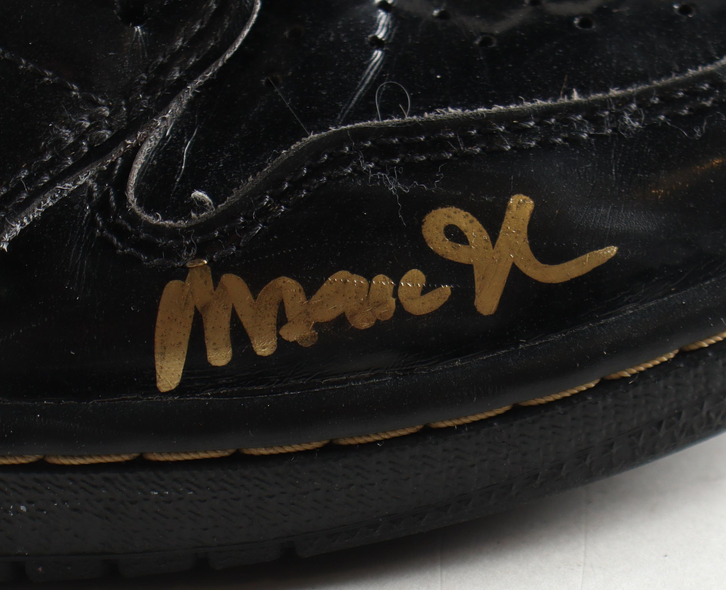 Set of (2) Nike Jordan Basketball Shoes have been hand-signed by Magic Johnson (Los Angeles Lakers, HOF) and Larry Bird (Boston Celtics, HOF). RIght shoe is signed by Johnson, Left shoe is signed by Bird.