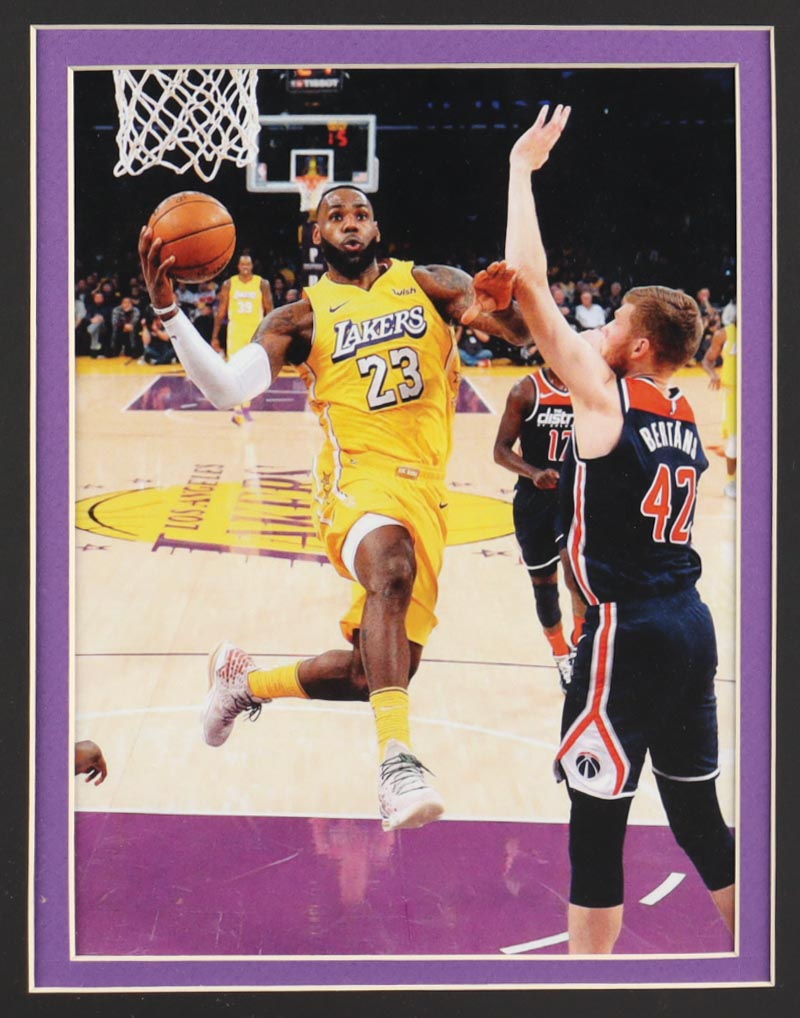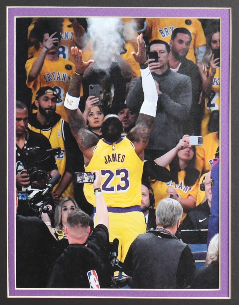 Custom frame measures approximately 32" x 36" in size and features an unsigned LeBron James jersey. The display also includes a 2020 Championship pin as well as (2) cloth team logo patches. Please note, the display is unsigned.