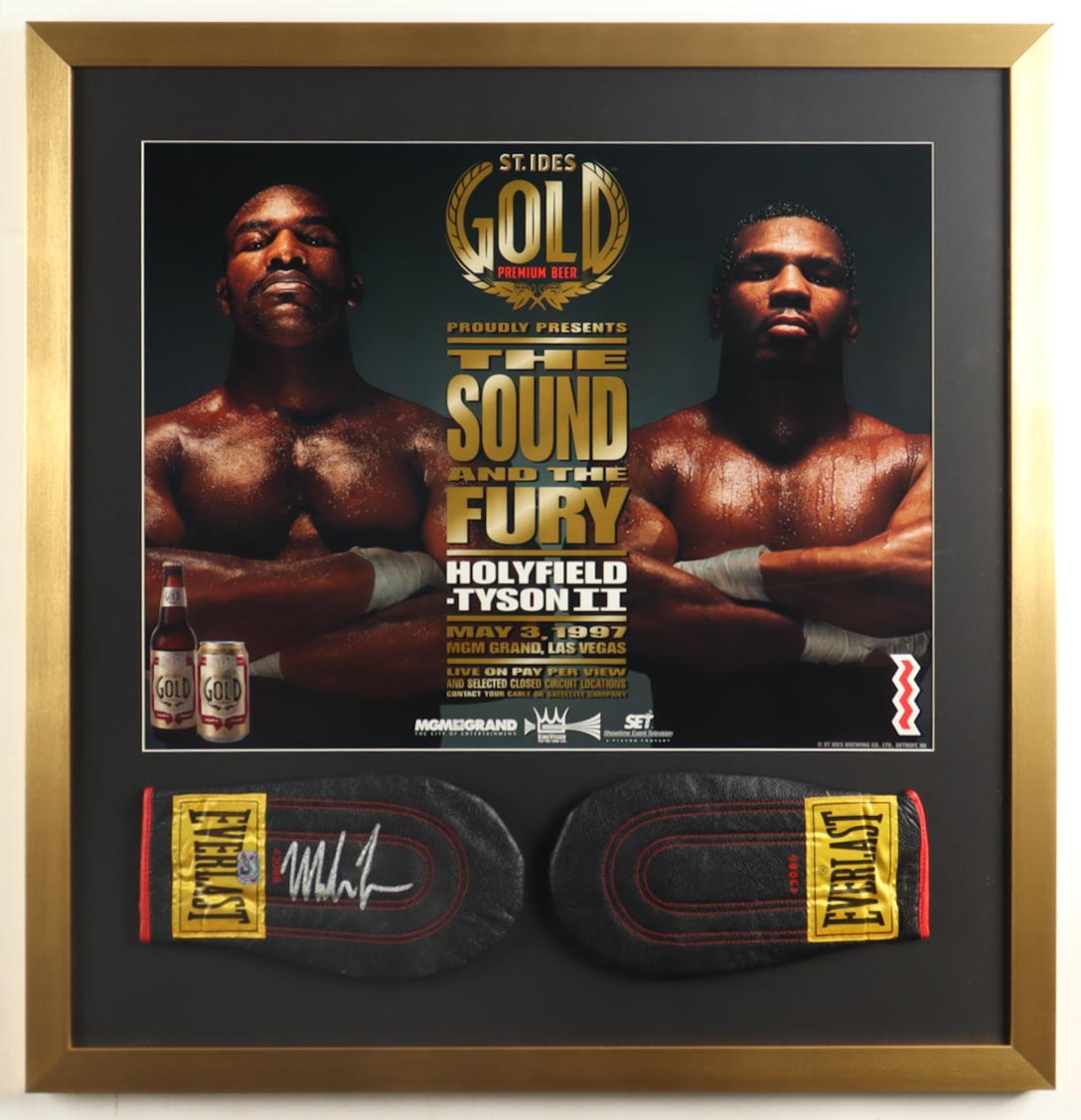Custom frame measures approximately 28" x 29" in size and features a pair of Everlast sparring gloves. Hand-signed by Mike Tyson (HOF). The display also includes an unsigned Tyson Vs Holyfield MGM Grand Fight Poster.