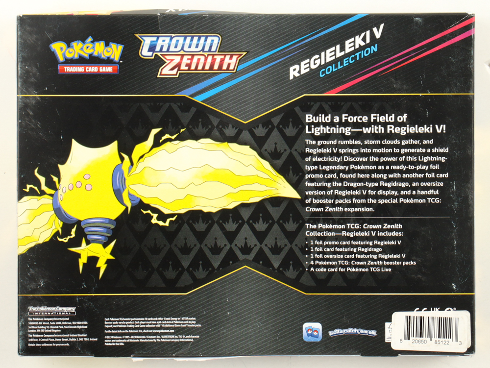 Two previously unknown Legendary Pokémon have awakened in the frozen tundra! Discover the power of the Lightning-type Regieleki or the Dragon-type Regidrago in these two collections. The star Pokémon appears as a ready-to-play foil promo card and an oversize card for display, accompanied by a foil card featuring its counterpart and a handful of booster packs from the special Pokémon TCG: Crown Zenith expansion.