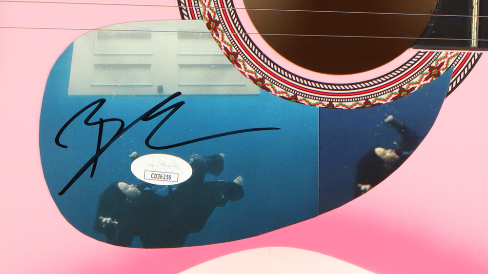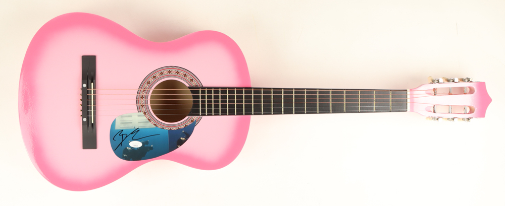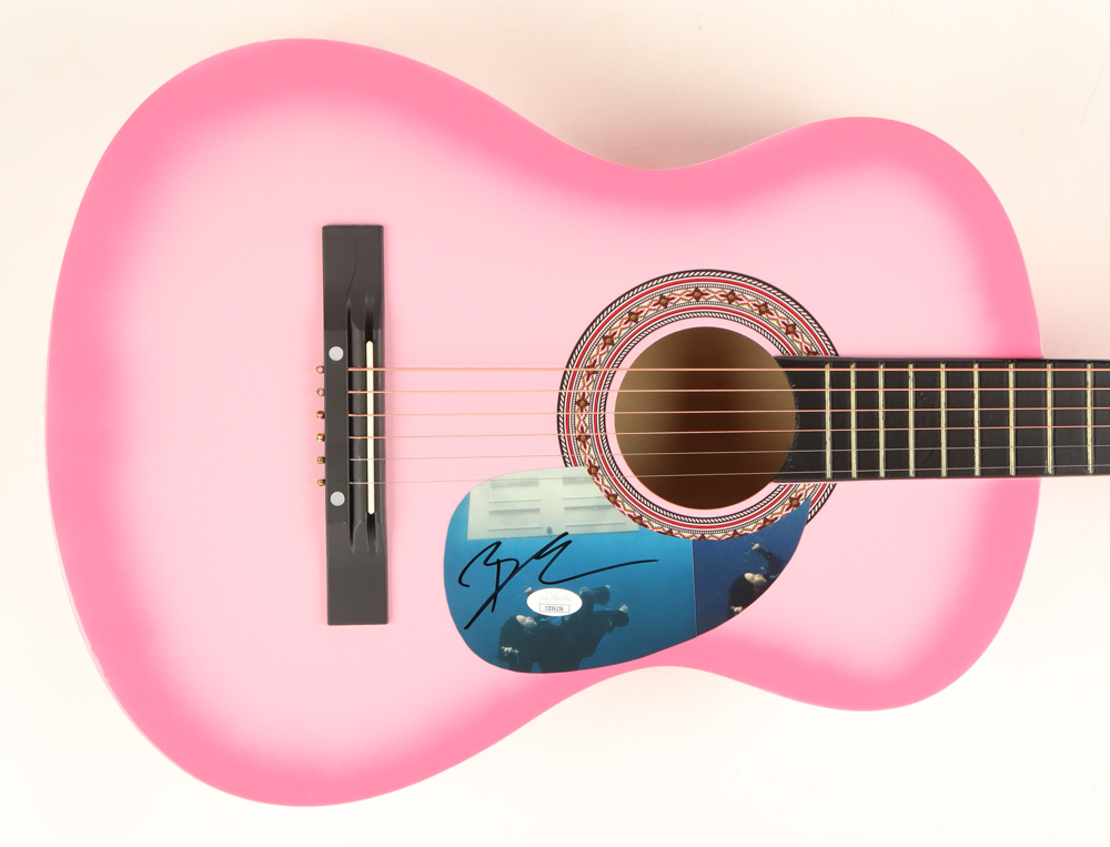 Acoustic guitar measures approximately 38" in length and has been hand-signed on a CD cover that has been repurposed as a pick-guard by Billie Eilish.