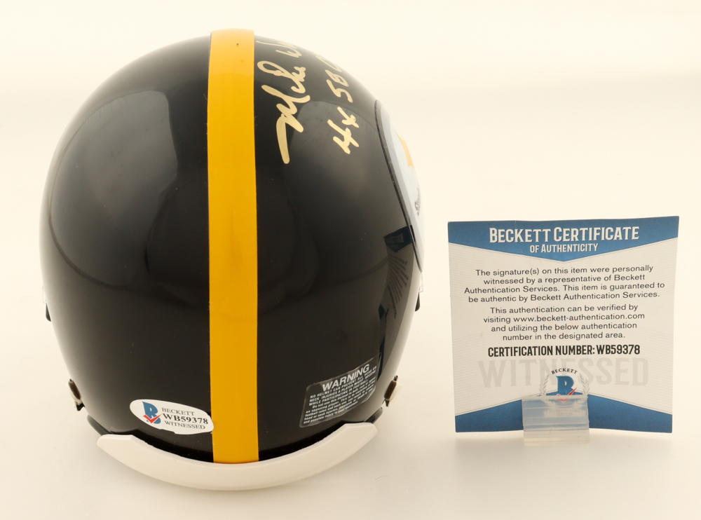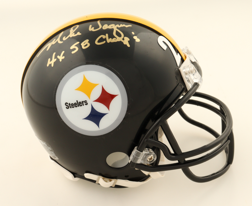 Riddell Pittsburgh Steelers mini helmet. Hand-signed and inscribed by Mike Wagner.