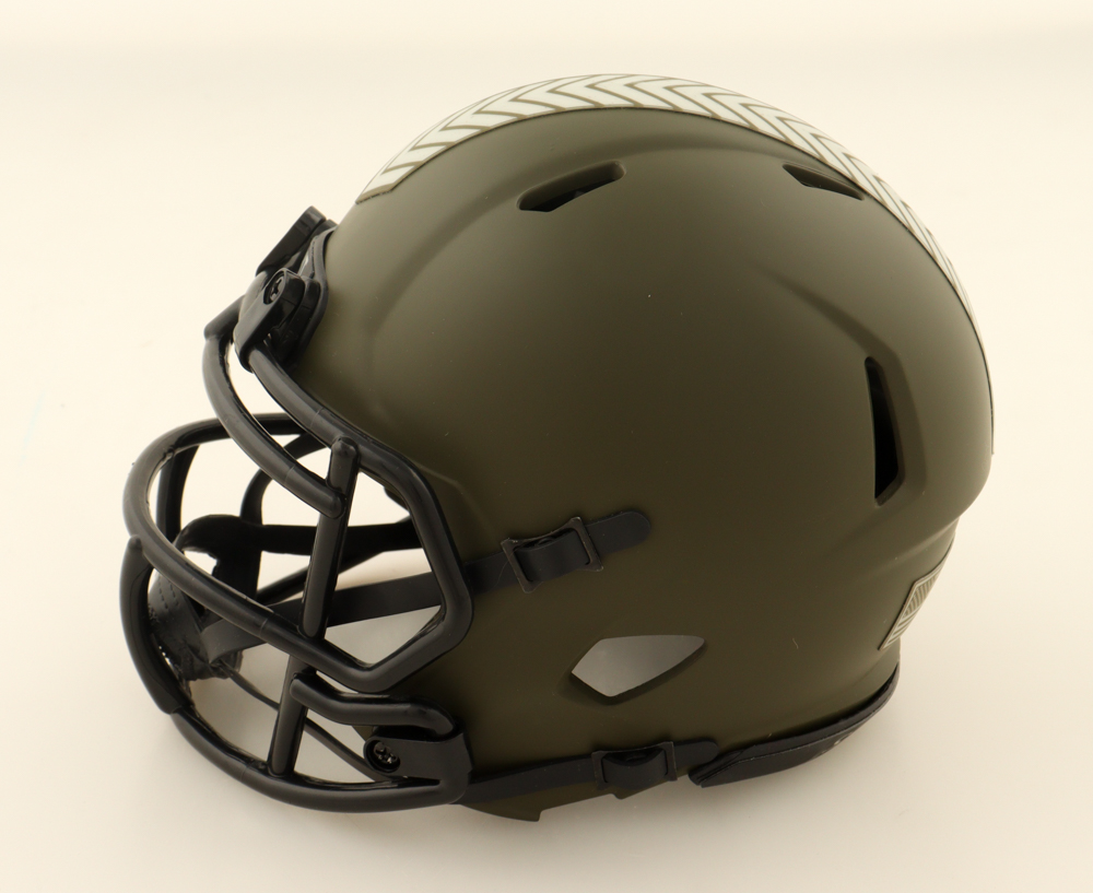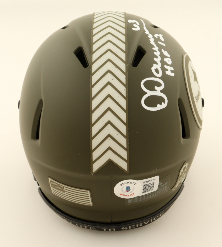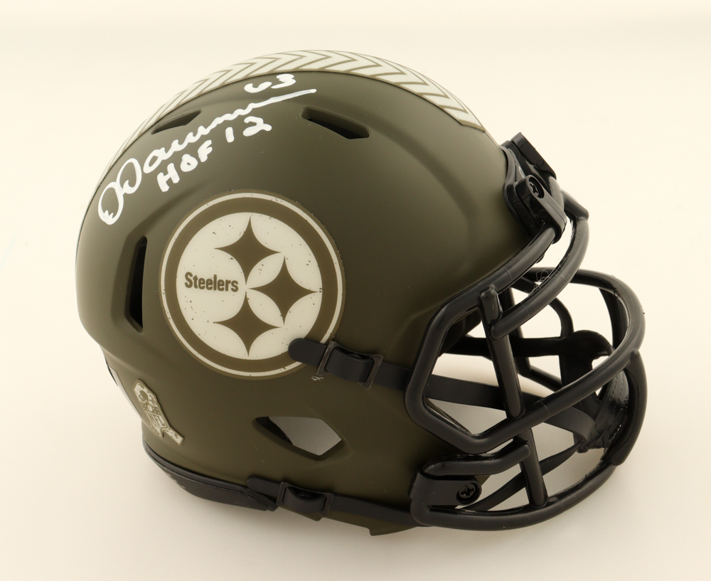 Riddell Pittsburgh Steelers Salute To Service Alternate Speed Mini Helmet has been hand-signed and inscribed by Dermontti Dawson (HOF).