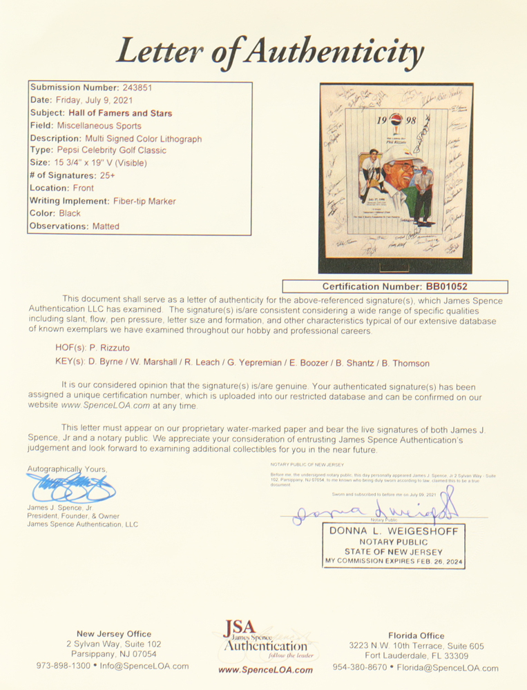 1998 Pepsi Celebrity Golf Classic Hall of Famers & Stars Custom Matted Lithograph Display Signed By (25+) With Phil Rizzuto, Darryn Byrne, Warren Marshall, Roy Leach (JSA)