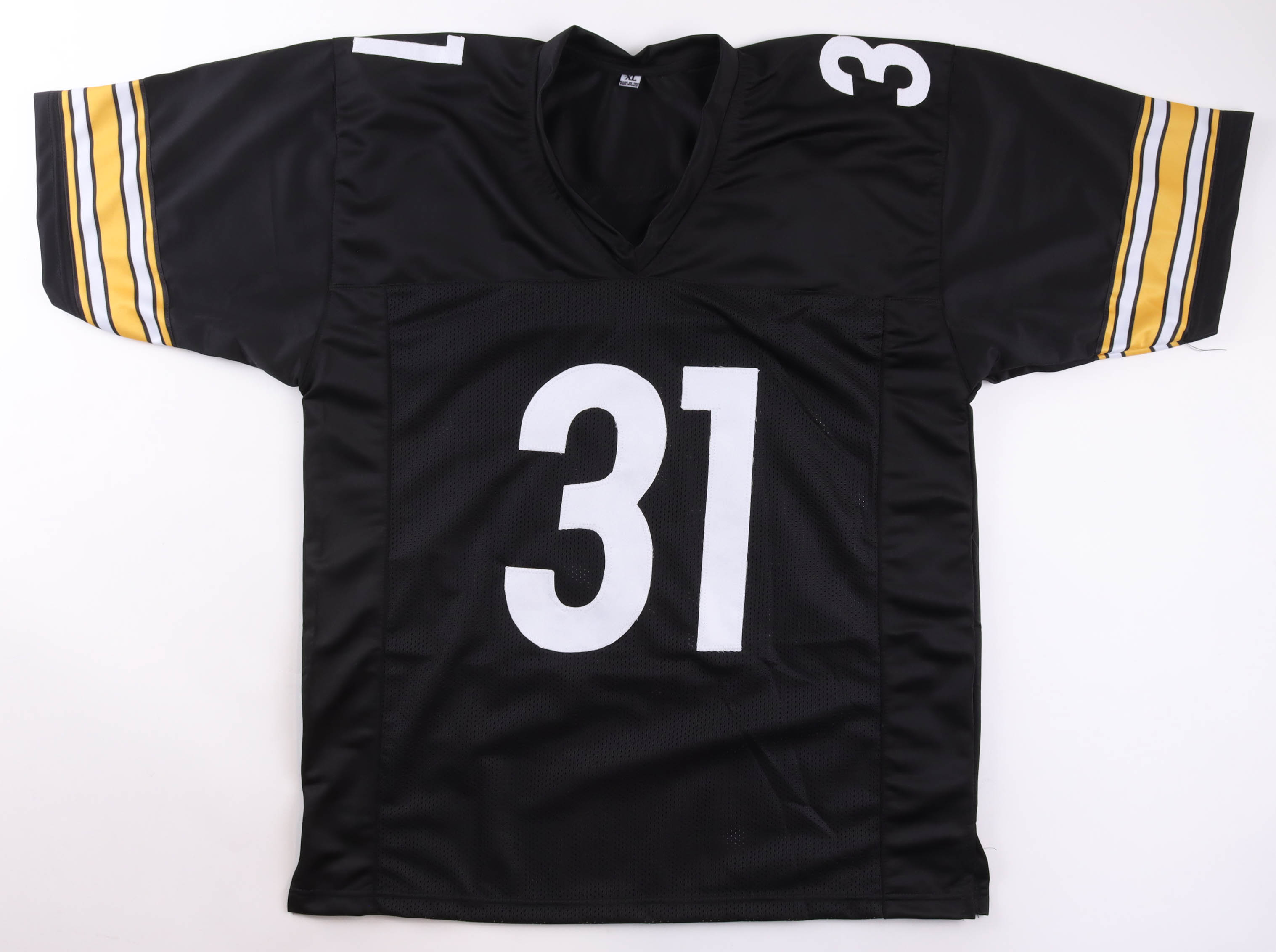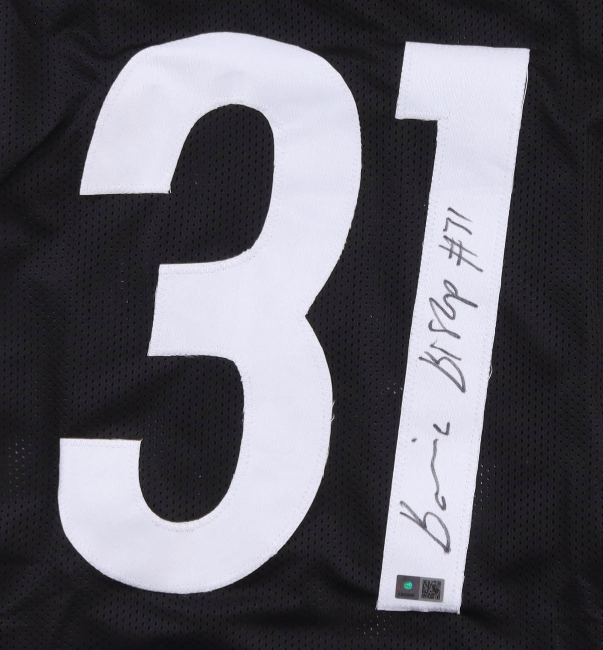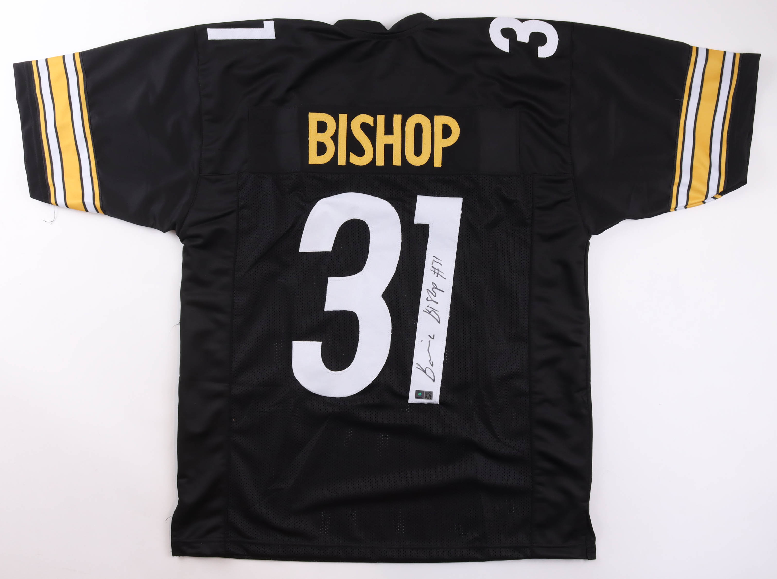 Custom jersey with everything sewn on, size XL. Hand-signed by Beanie Bishop.