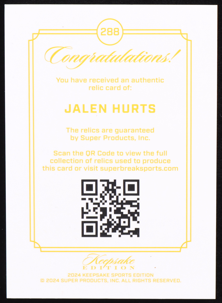Jalen Hurts 2024 Keepsake Edition Gem Relic #288 #96/99