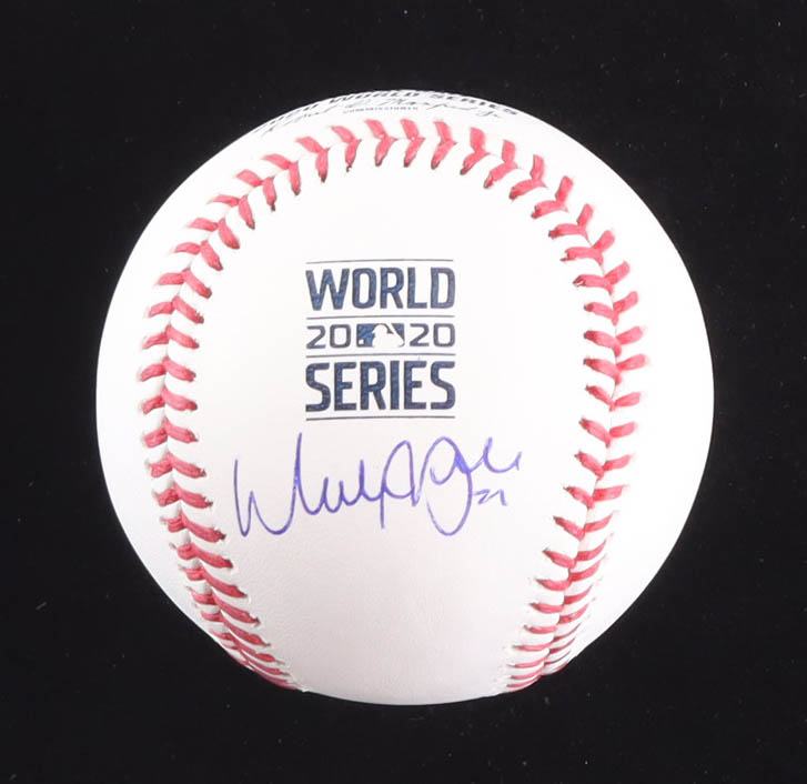 Rawlings Official 2020 World Series Logo baseball has been hand signed by Walker Buehler (Los Angeles Dodgers).