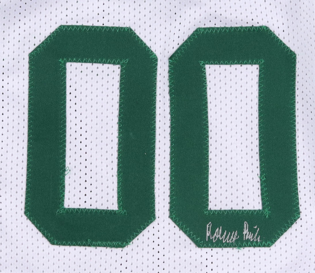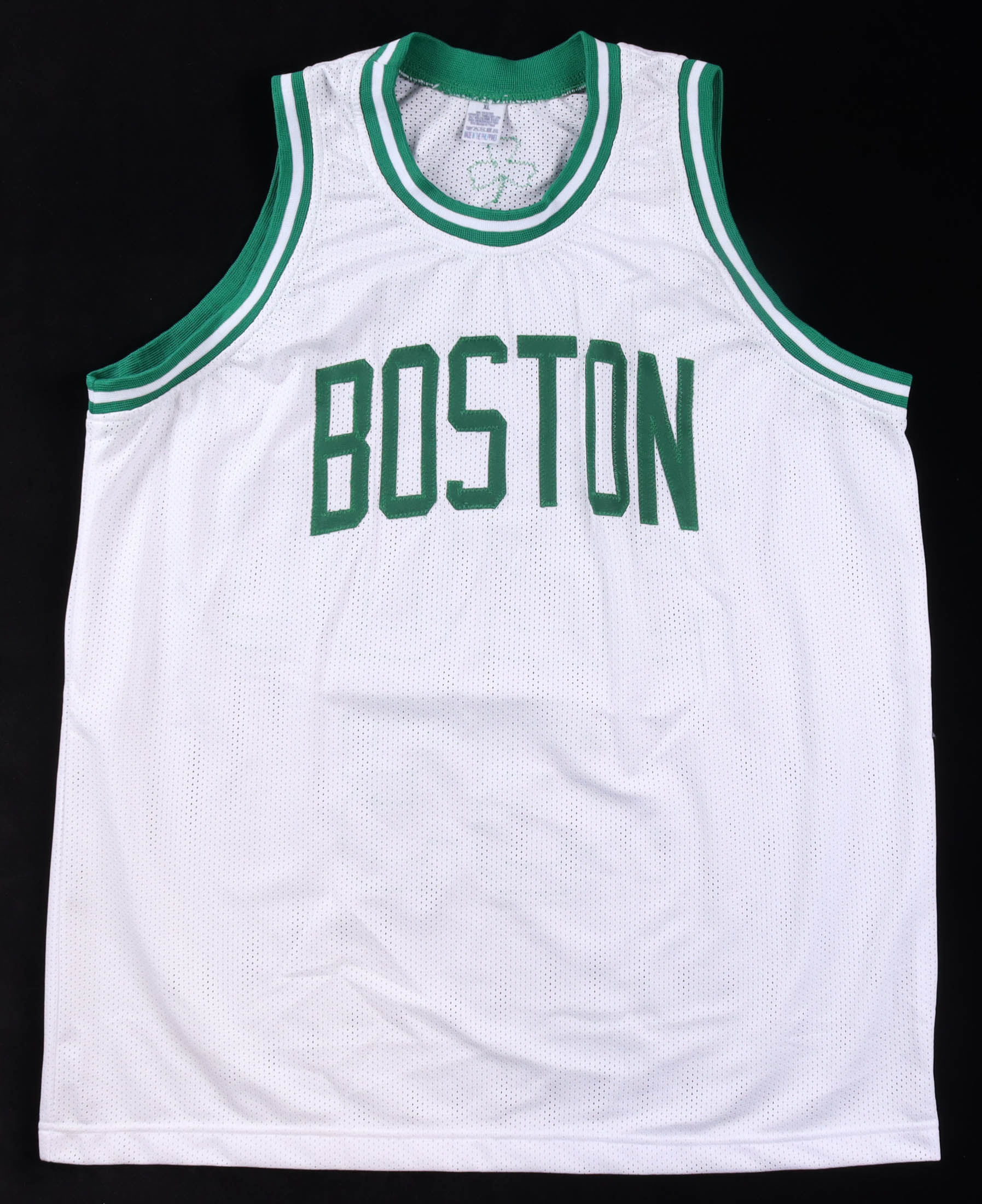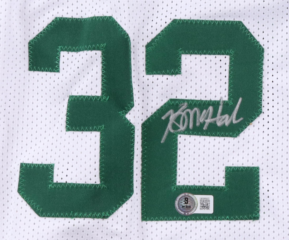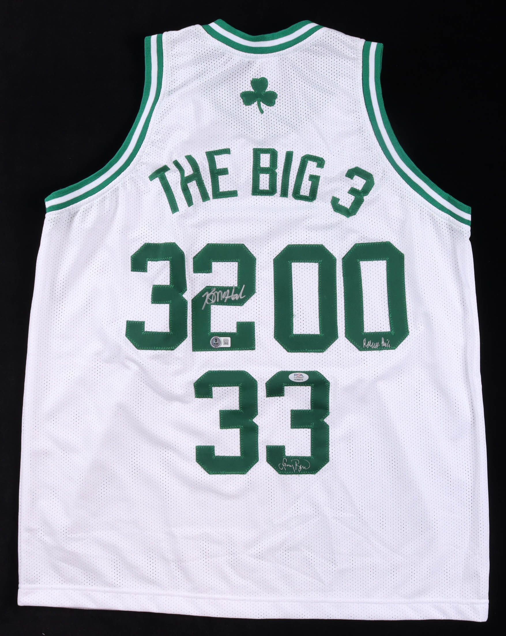 Custom Boston Celtics jersey with everything sewn on, size XL. Hand-signed by Kevin McHale (HOF), Robert Parish (HOF), and Larry Bird.