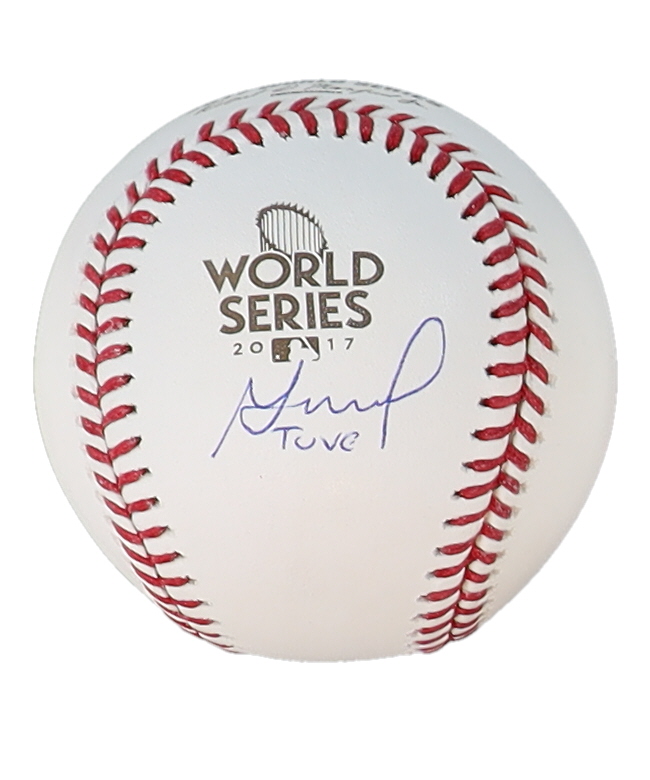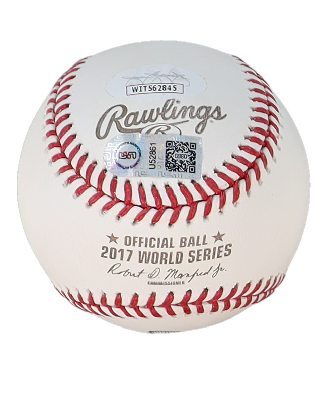 Rawlings Official 2017 World Series baseball. Hand-signed by Jose Altuve (Houston Astros). Please note, there are minor stains throughout the baseball.