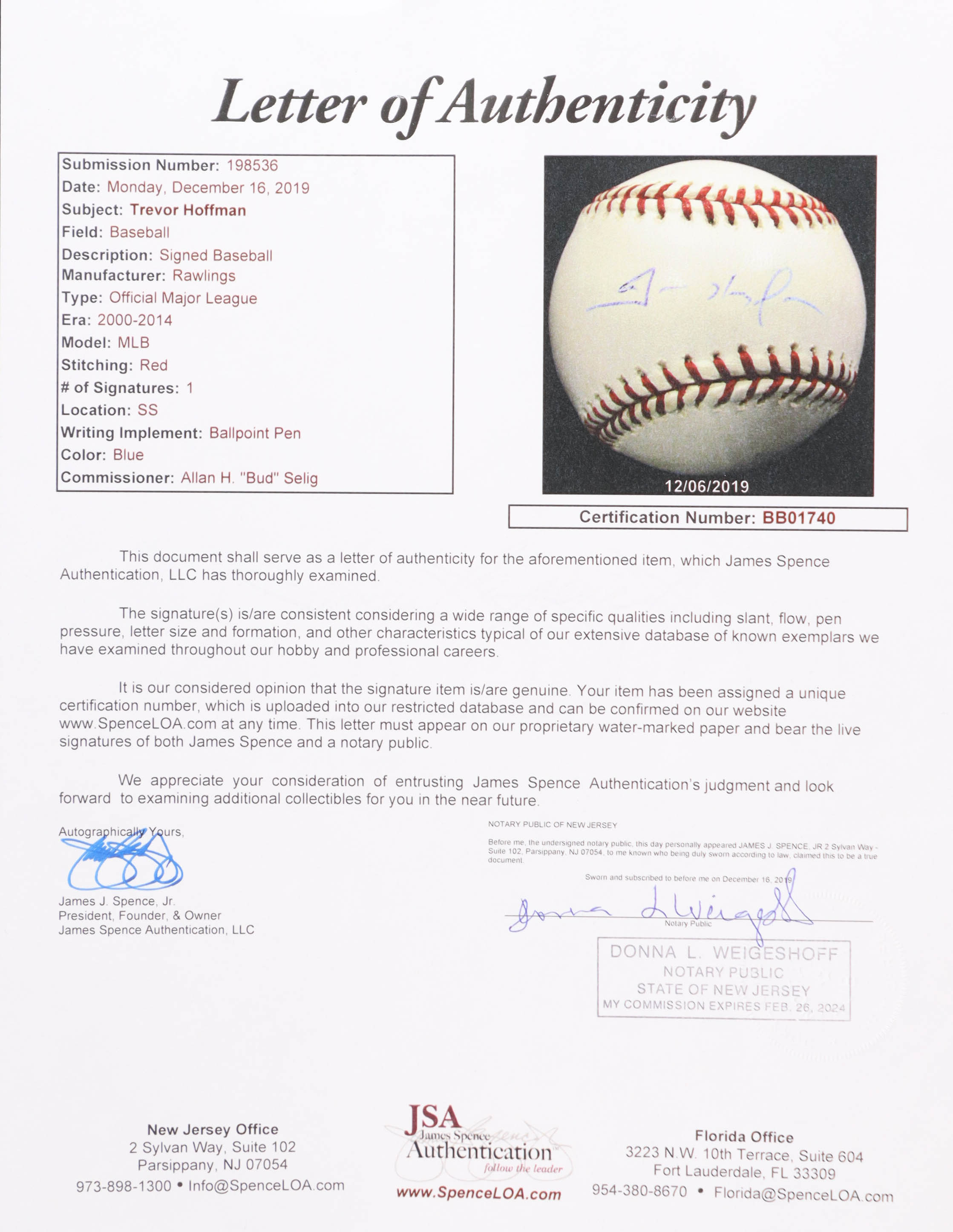 Rawlings Official Major League baseball has been hand-signed and inscribed by Trevor Hoffman (San Diego Padres, HOF).