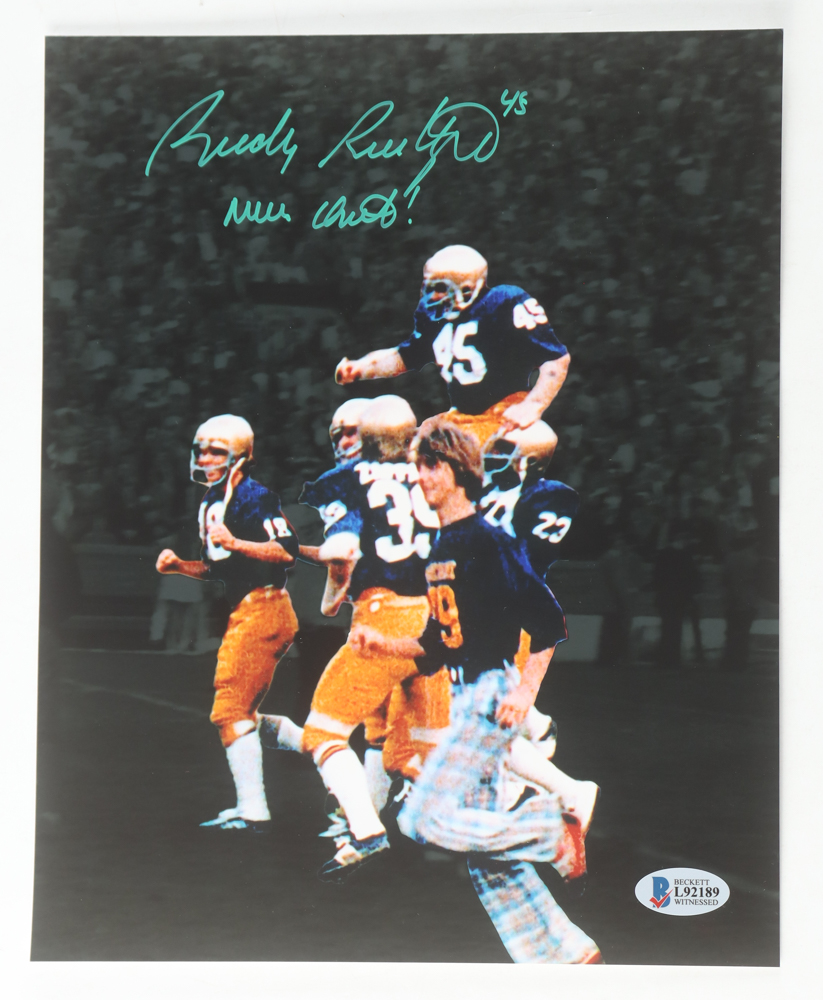 Photo measures 8" x 10" in size and has been hand-signed and inscribed by Rudy Ruettiger.