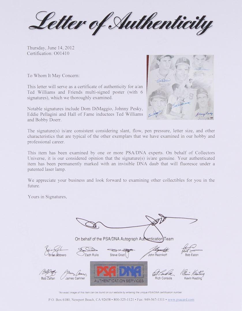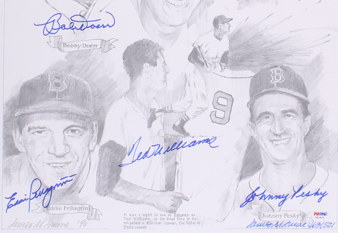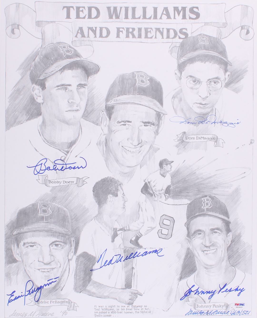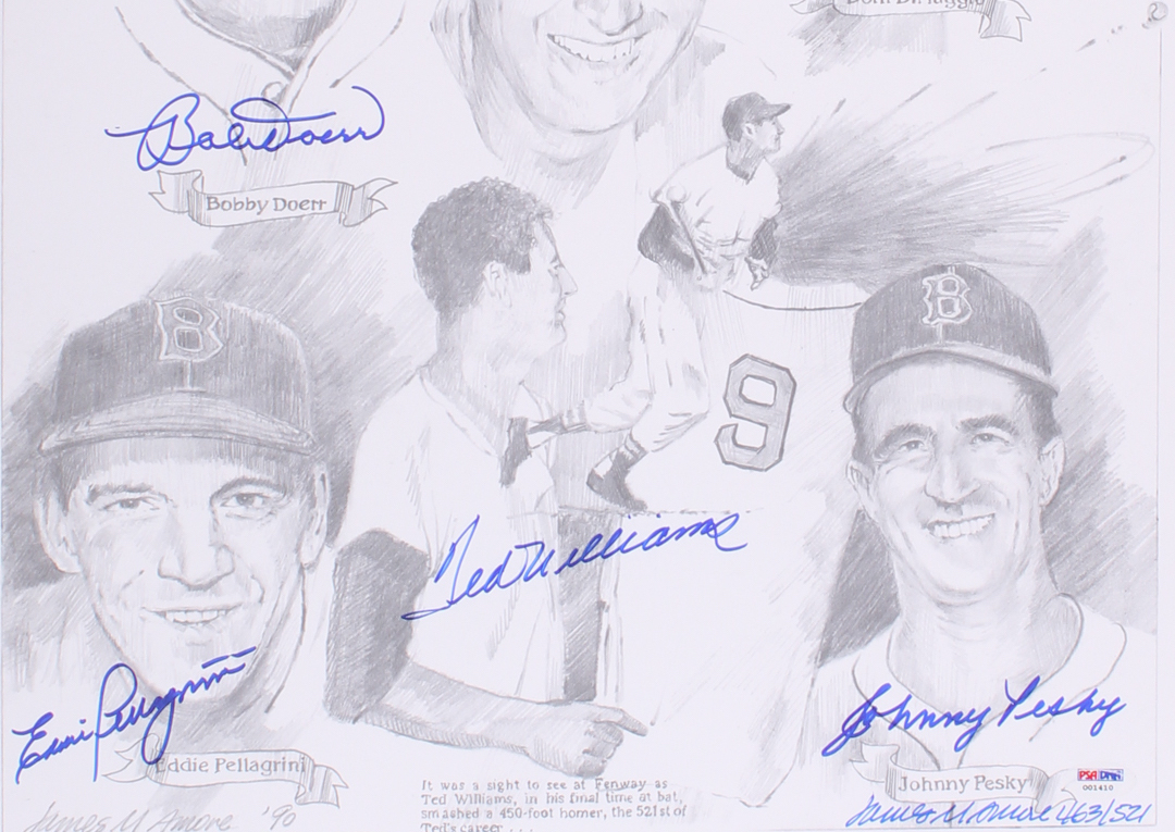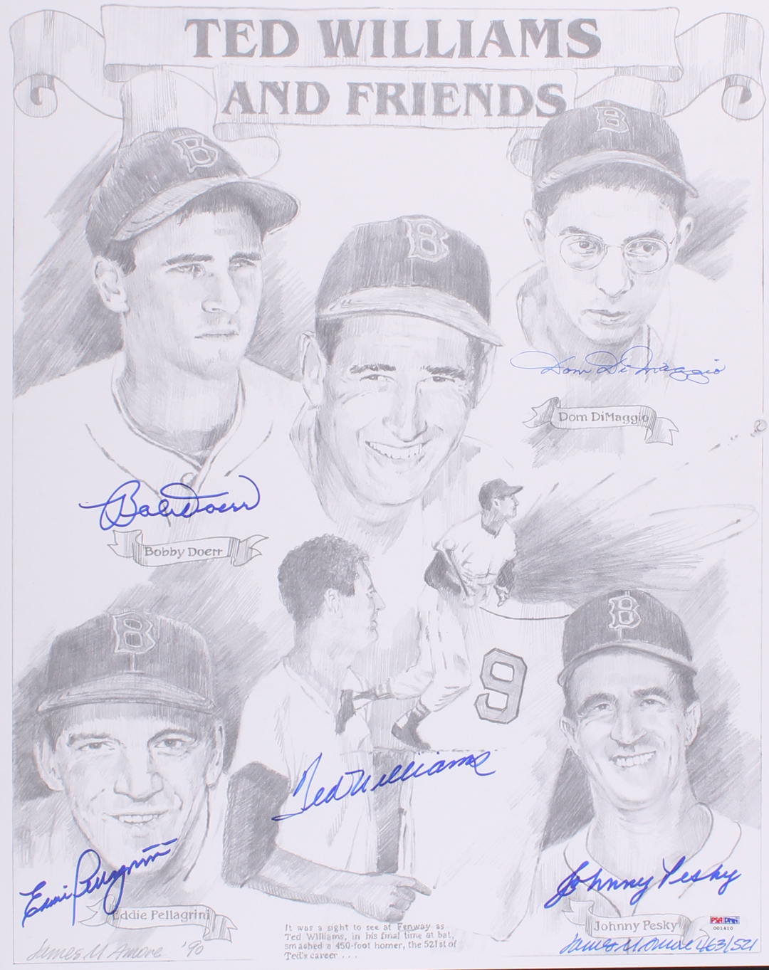 Lithograph measures 16" x 20" in size and has been hand-signed in blue felt-tip pen by (5) with Ted Williams (D. 2002, HOF), Bobby Doerr (HOF), Dom DiMaggio (D. 2009), Johnny Pesky (D. 2012), and Eddie Pellagrini (D. 2006). The lithograph has been hand-signed and hand-numbered in blue felt-tip pen by the artist.