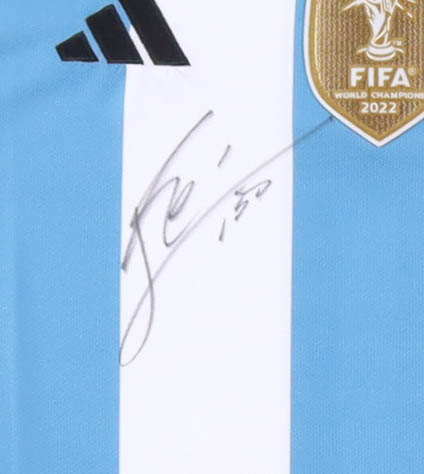 Adidas jersey with everything printed on, size M. Hand-signed and inscribed by Lionel Messi.
