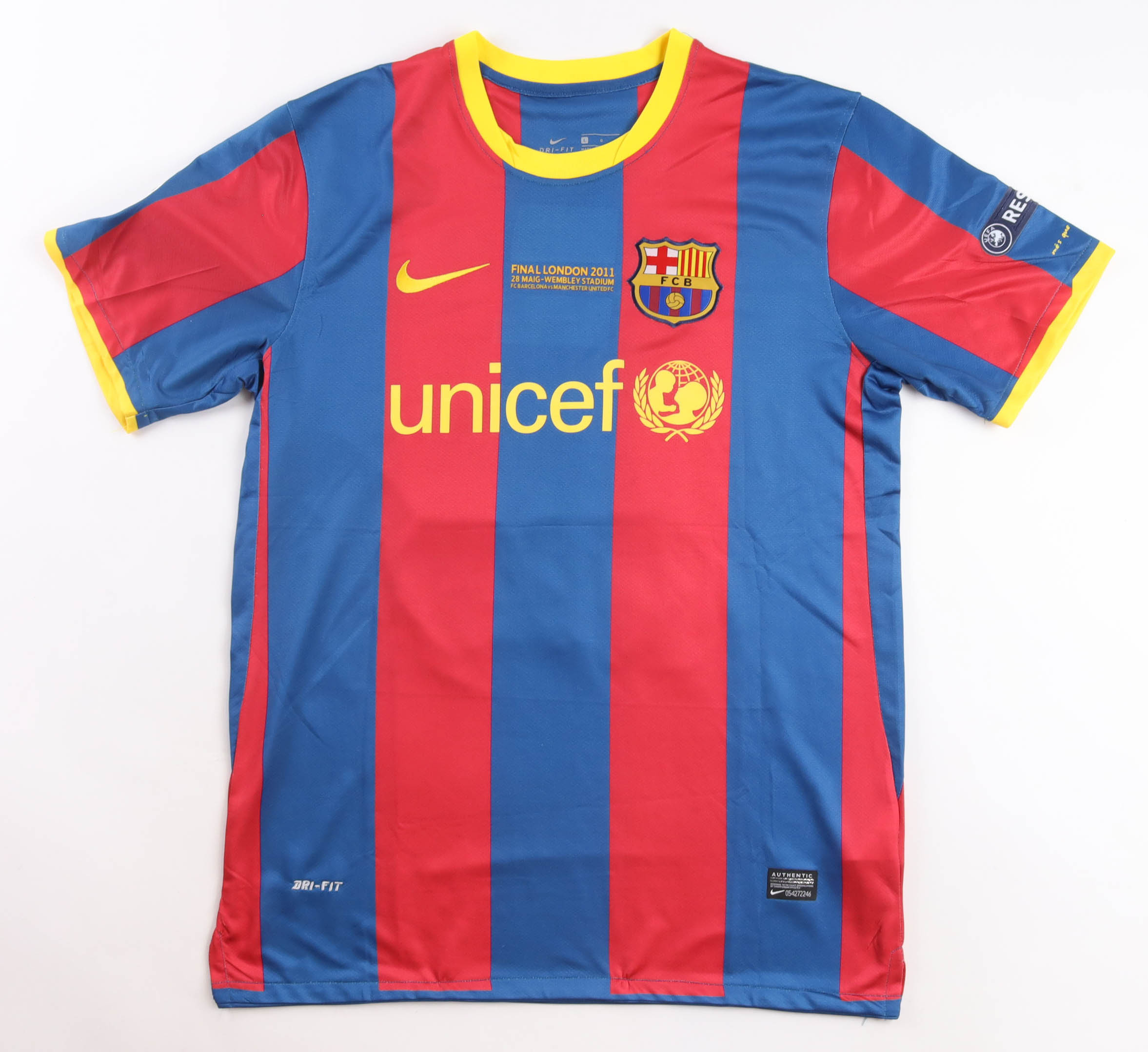 Nike jersey with everything printed on, size L. Hand-signed by Lionel Messi. Please note, there is staining on the reverse number. See photos regarding the condition of the item.
