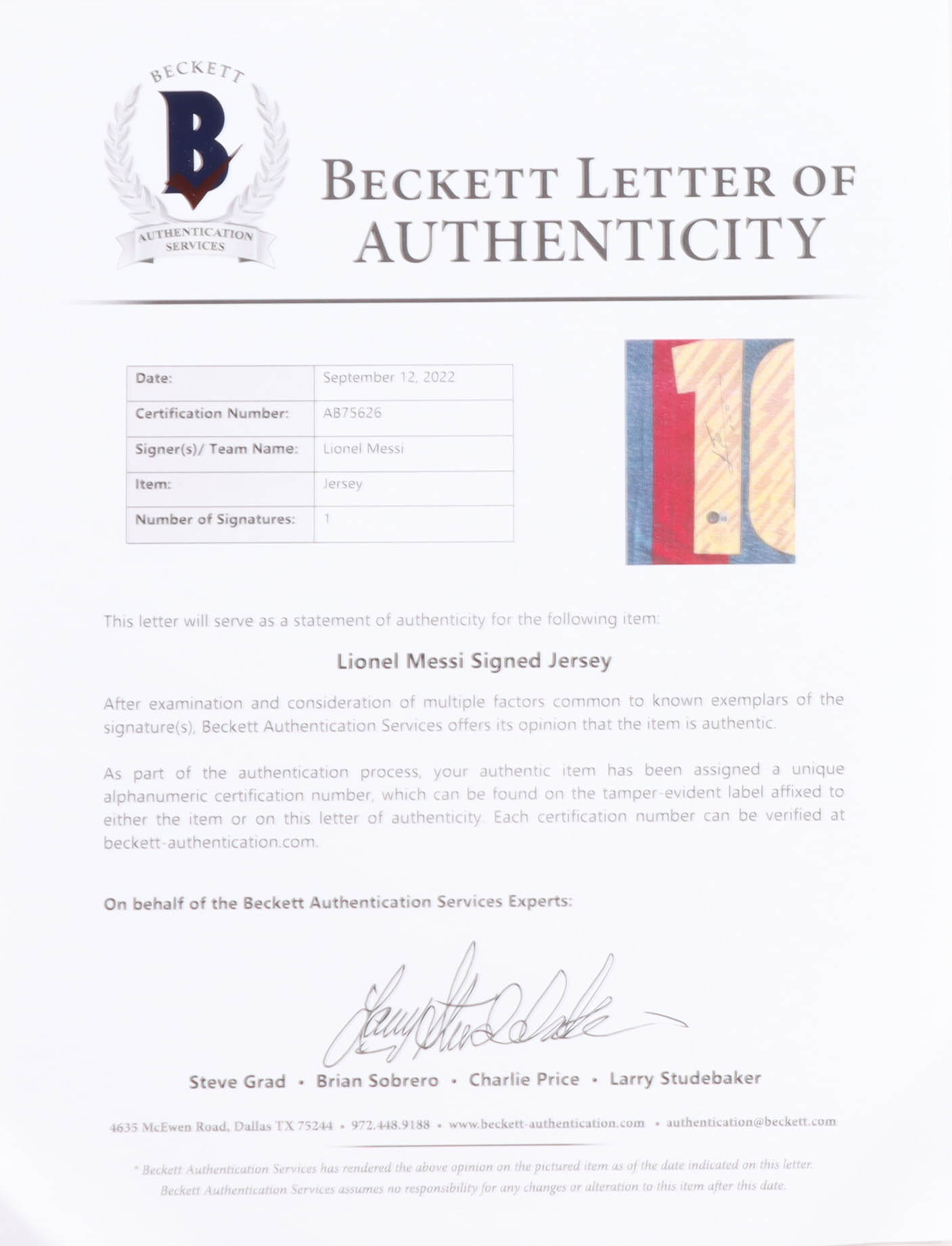 The autograph includes an official Beckett Authentication Services serially numbered hologram for authenticity purposes.