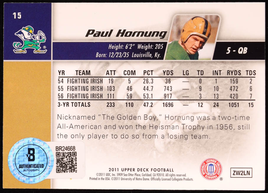 Paul Hornung Signed 2011 Upper Deck #15 (Beckett)
