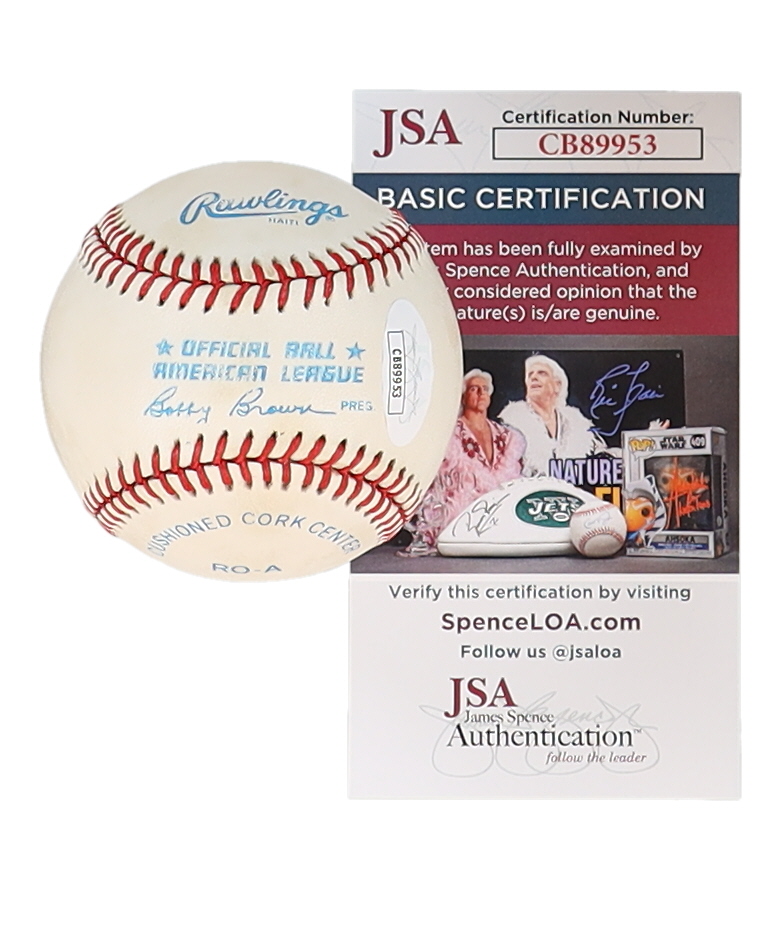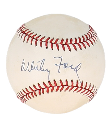 Rawlings Official American League Baseball. Hand-signed by Whitey Ford (D. 2020, New York Yankees, HOF). Please note, the baseball is naturally toned and stained.