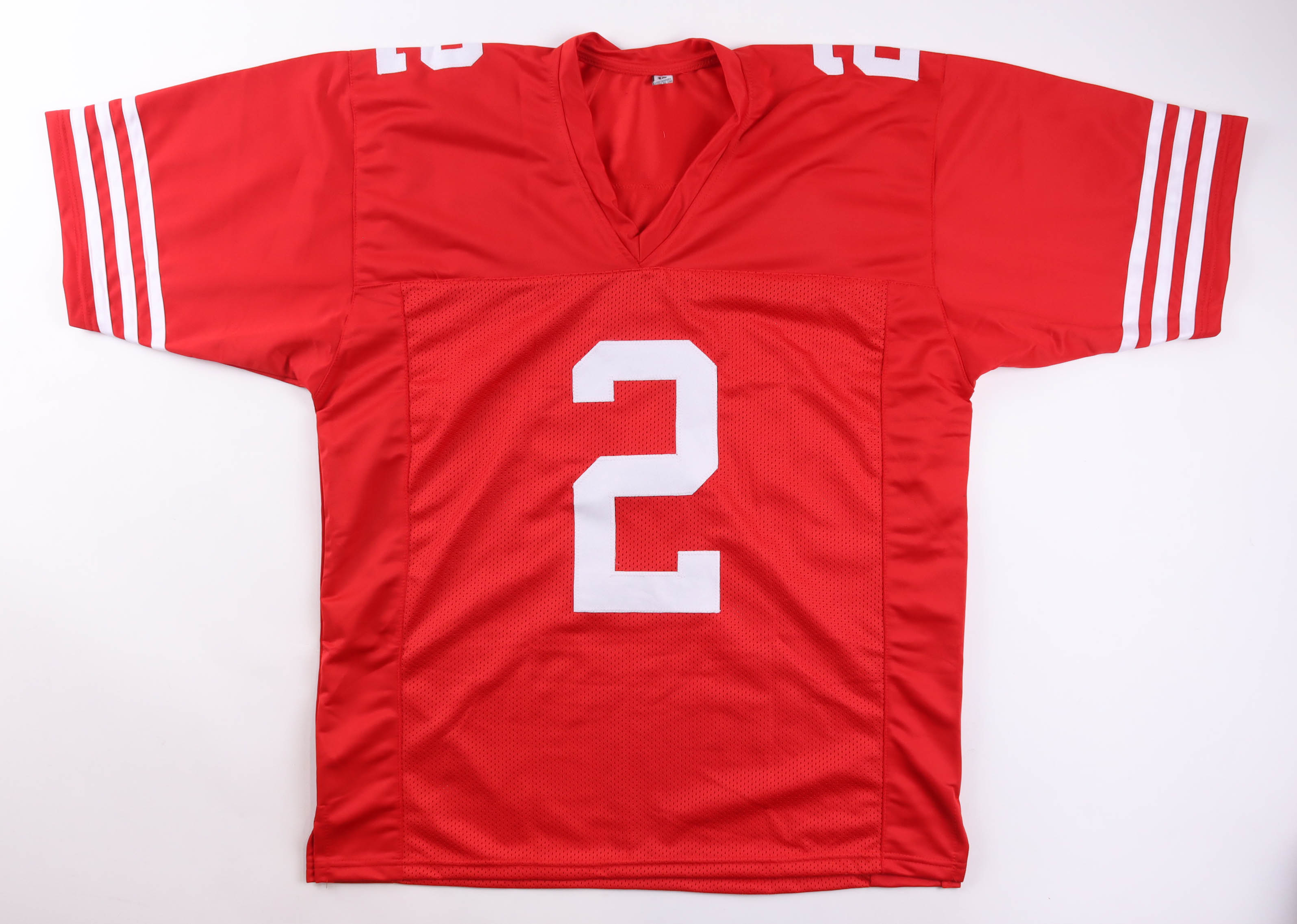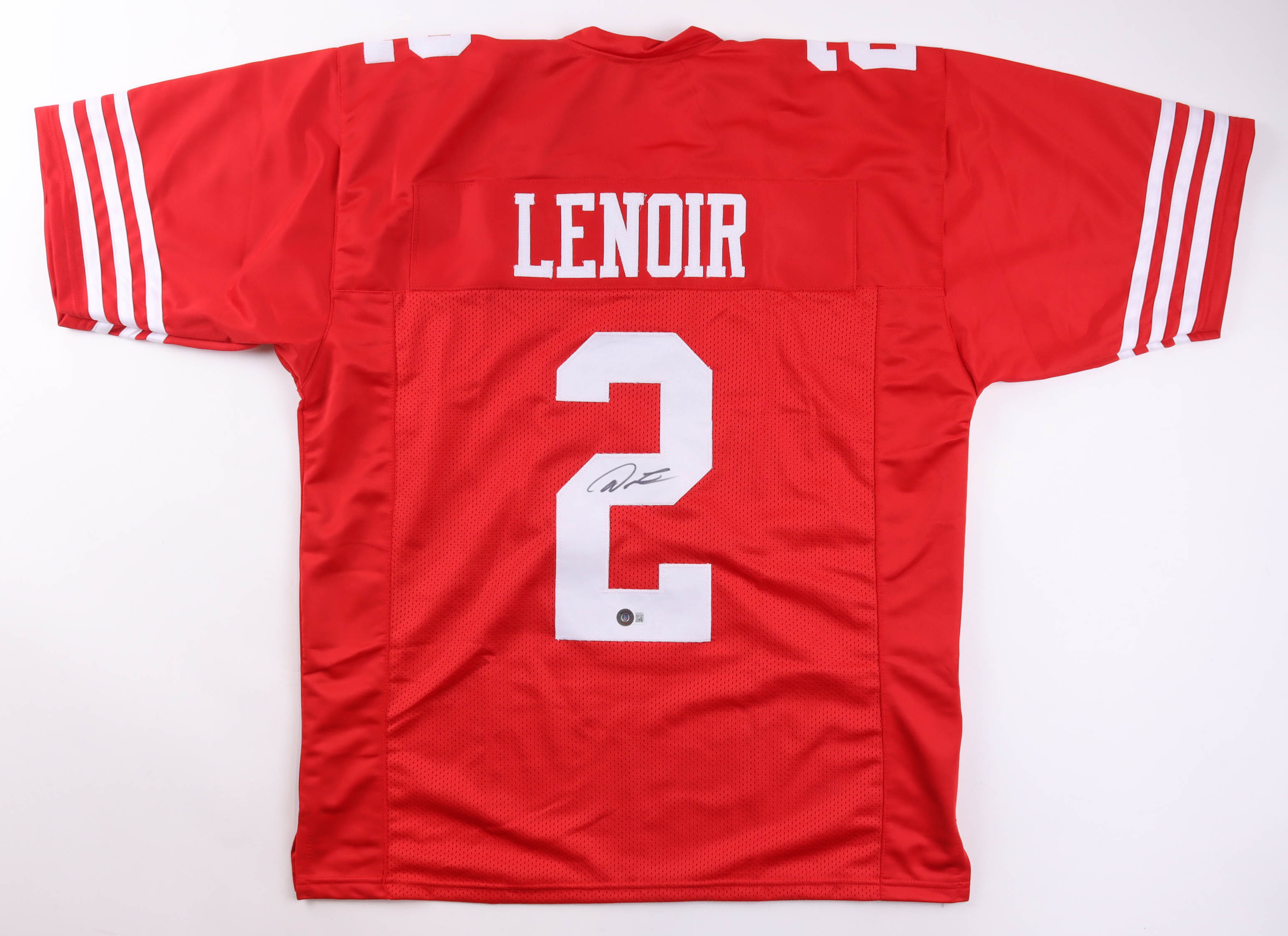 Custom jersey. Everything is sewn on, size XL. Hand-signed by Deommodore Lenoir.