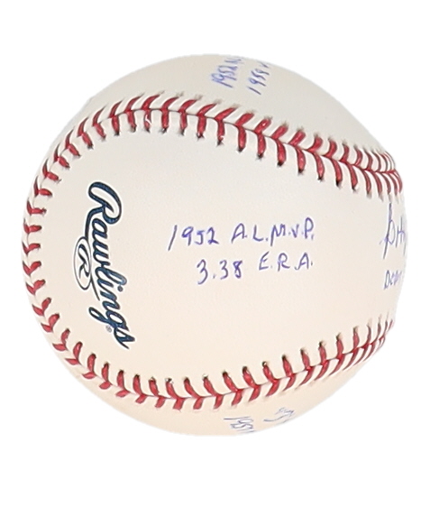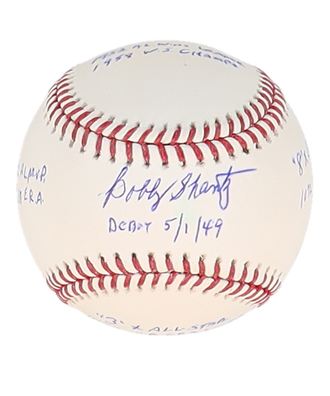 Rawlings Official Major League Baseball. Hand-signed and inscribed by Bobby Shantz (Kansas City Athletics). Please note, some inscriptions have bled and there are stains throughout the baseball.