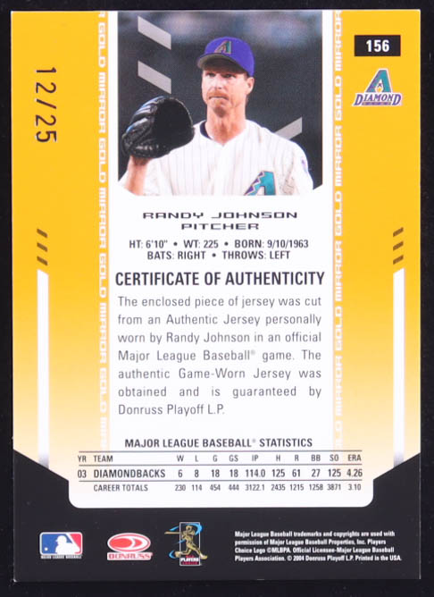 Randy Johnson 2004 Leaf Certified Materials Mirror Fabric Gold Number #156 / Jersey #12/25
