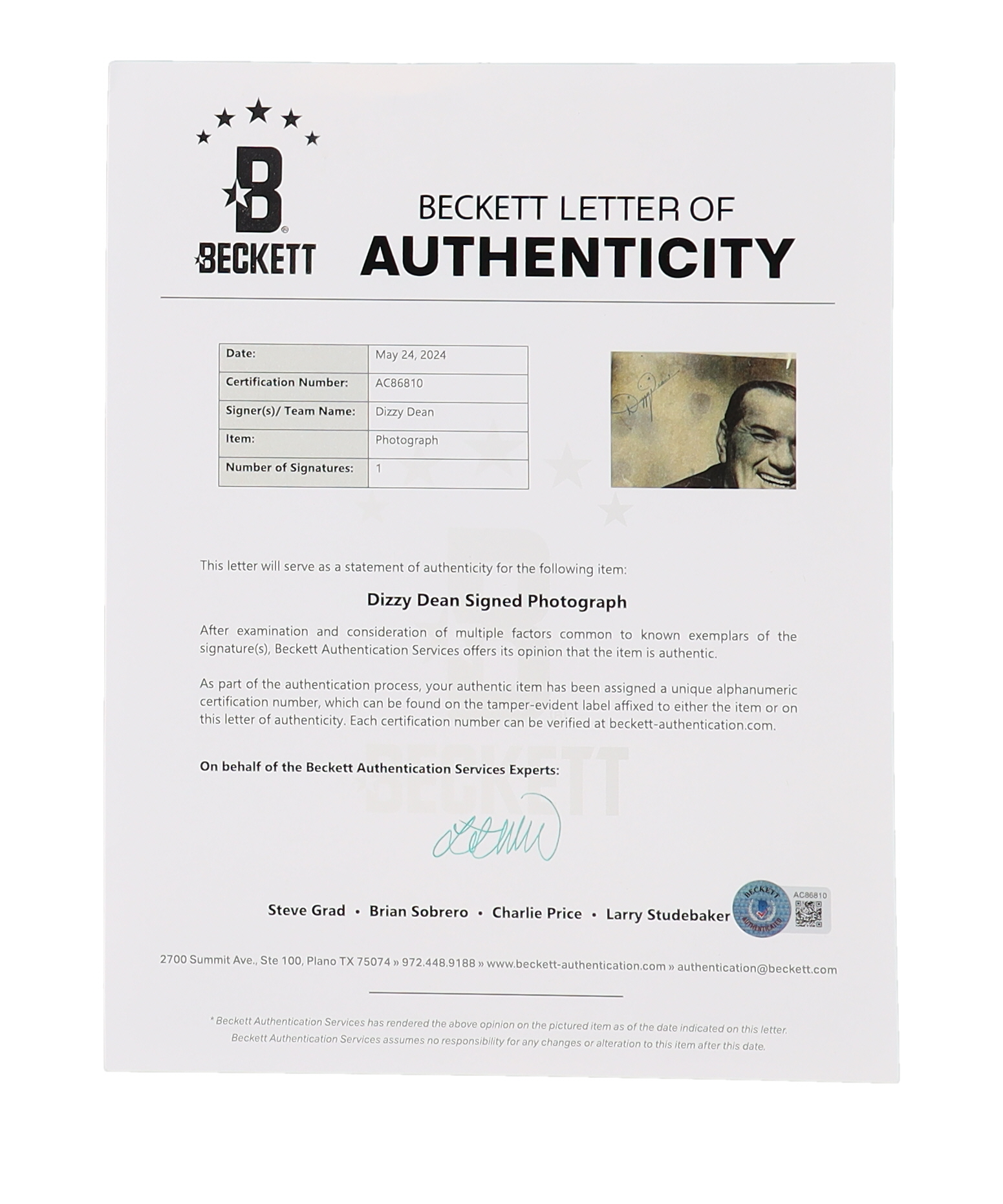 Photo measures 8" x 10" in size and has been hand-signed by Dizzy Dean (D. 1974, HOF). Please note, the top of the photo is torn as well as the surface and corners are creased.