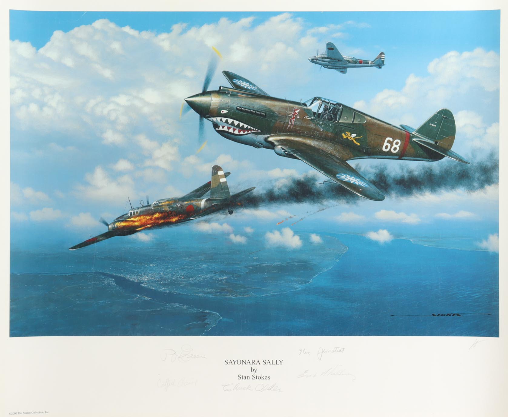 'Sayonara Sally' Lithograph measures approximately 18" x 22" in size. Hand-signed by (5) with Charles Older (D. 2006, WWII Pilot), Ken Jernstedt (D. 2013, WWII Pilot), Paul Greene, Robert Raine and Erik Shilling. Lithograph is also signed by the artist, Stan Stokes.